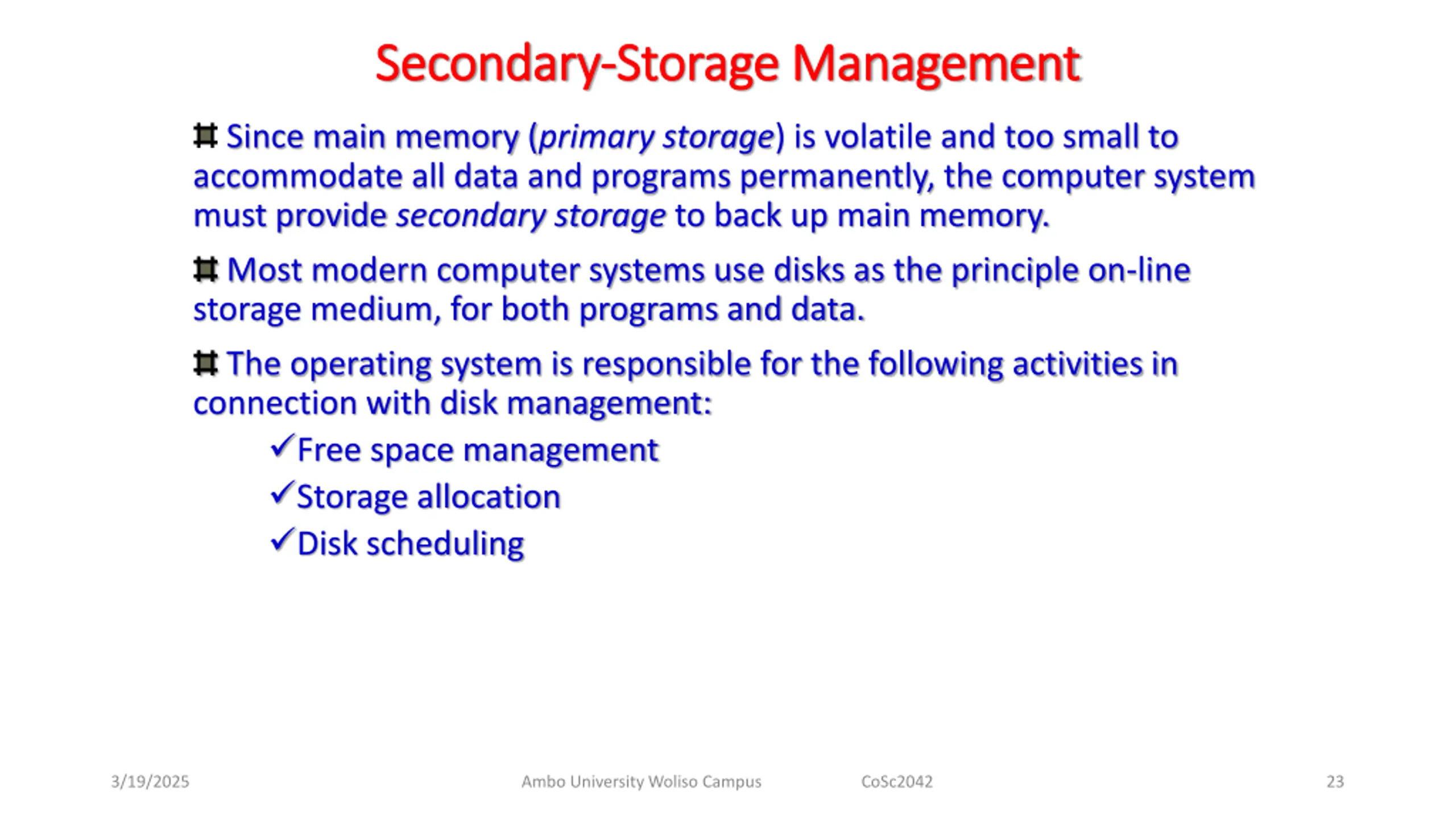 Secondary Secondary- -Storage Management Storage Management Since main memory (primary storage) is volatile and too small to accommodate all data and programs permanently, the computer system must provide secondary storage to back up main memory. Most modern computer systems use disks as the principle on-line storage medium, for both programs and data. The operating system is responsible for the following activities in connection with disk management: Free space management Storage allocation Disk scheduling 3/19/2025 Ambo University Woliso Campus CoSc2042 23