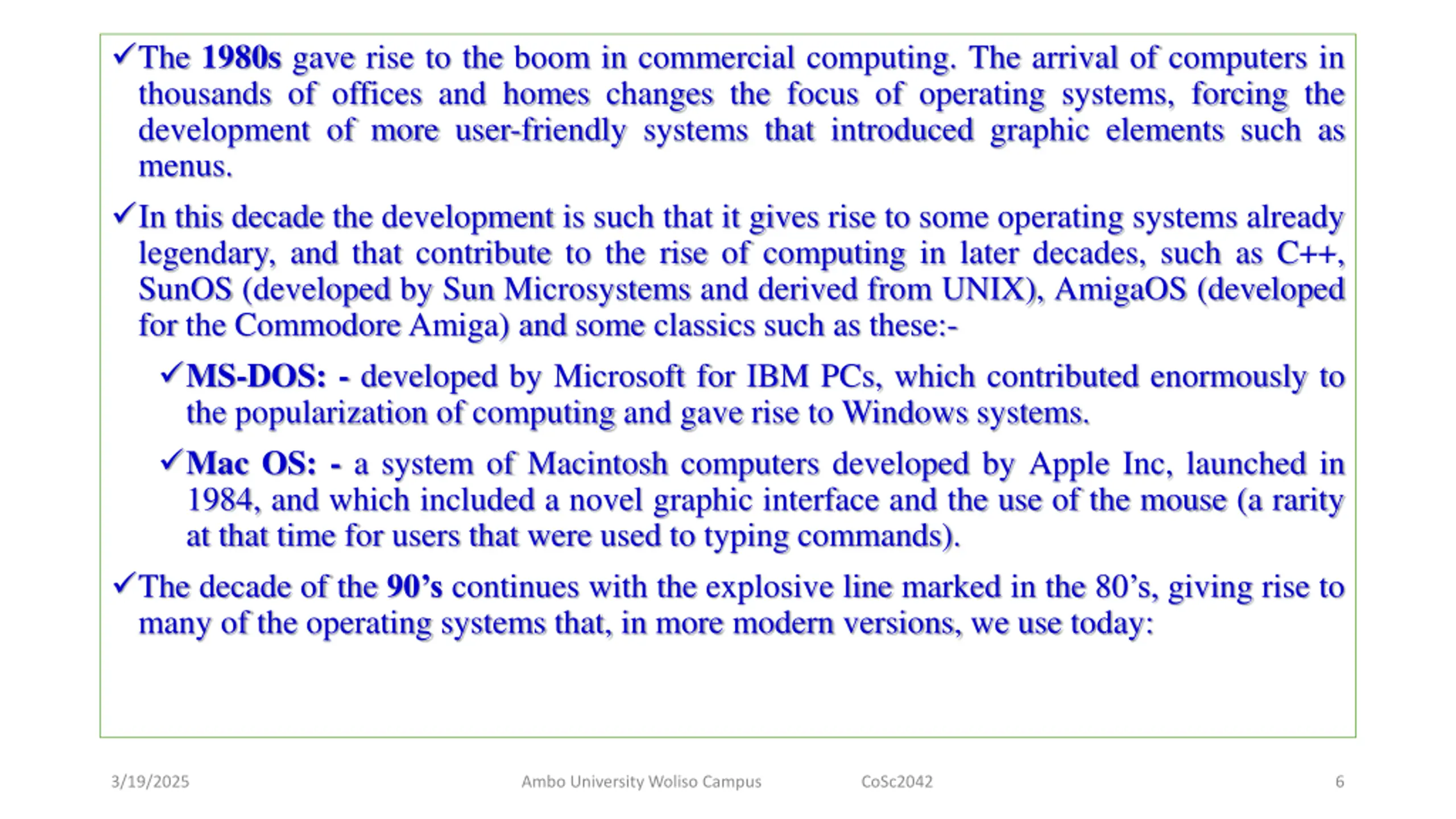 The 1980s gave rise to the boom in commercial computing. The arrival of computers in thousands of offices and homes changes the focus of operating systems, forcing the development of more user-friendly systems that introduced graphic elements such as menus. In this decade the development is such that it gives rise to some operating systems already legendary, and that contribute to the rise of computing in later decades, such as C++, SunOS (developed by Sun Microsystems and derived from UNIX), AmigaOS (developed for the Commodore Amiga) and some classics such as these:- MS-DOS: - developed by Microsoft for IBM PCs, which contributed enormously to the popularization of computing and gave rise to Windows systems. Mac OS: - a system of Macintosh computers developed by Apple Inc, launched in 1984, and which included a novel graphic interface and the use of the mouse (a rarity at that time for users that were used to typing commands). The decade of the 90 s continues with the explosive line marked in the 80 s, giving rise to many of the operating systems that, in more modern versions, we use today: 3/19/2025 Ambo University Woliso Campus CoSc2042 6