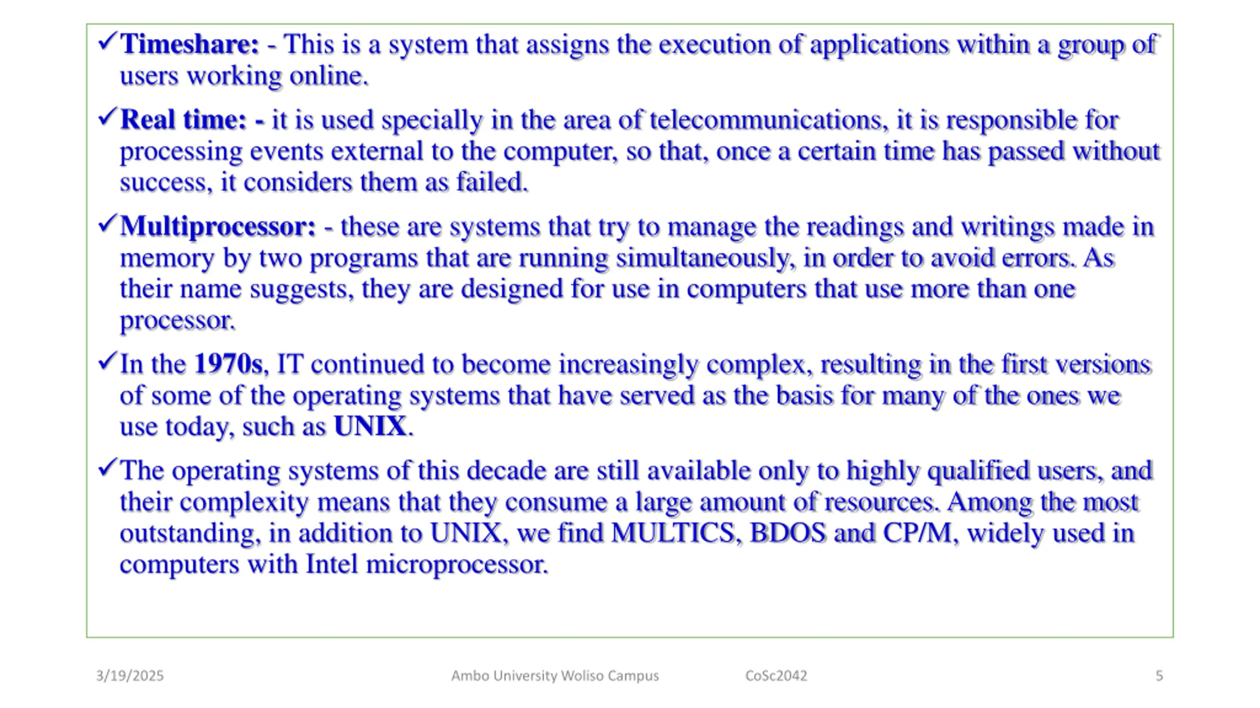 Timeshare: - This is a system that assigns the execution of applications within a group of users working online. Real time: - it is used specially in the area of telecommunications, it is responsible for processing events external to the computer, so that, once a certain time has passed without success, it considers them as failed. Multiprocessor: - these are systems that try to manage the readings and writings made in memory by two programs that are running simultaneously, in order to avoid errors. As their name suggests, they are designed for use in computers that use more than one processor. In the 1970s, IT continued to become increasingly complex, resulting in the first versions of some of the operating systems that have served as the basis for many of the ones we use today, such as UNIX. The operating systems of this decade are still available only to highly qualified users, and their complexity means that they consume a large amount of resources. Among the most outstanding, in addition to UNIX, we find MULTICS, BDOS and CP/M, widely used in computers with Intel microprocessor. 3/19/2025 Ambo University Woliso Campus CoSc2042 5