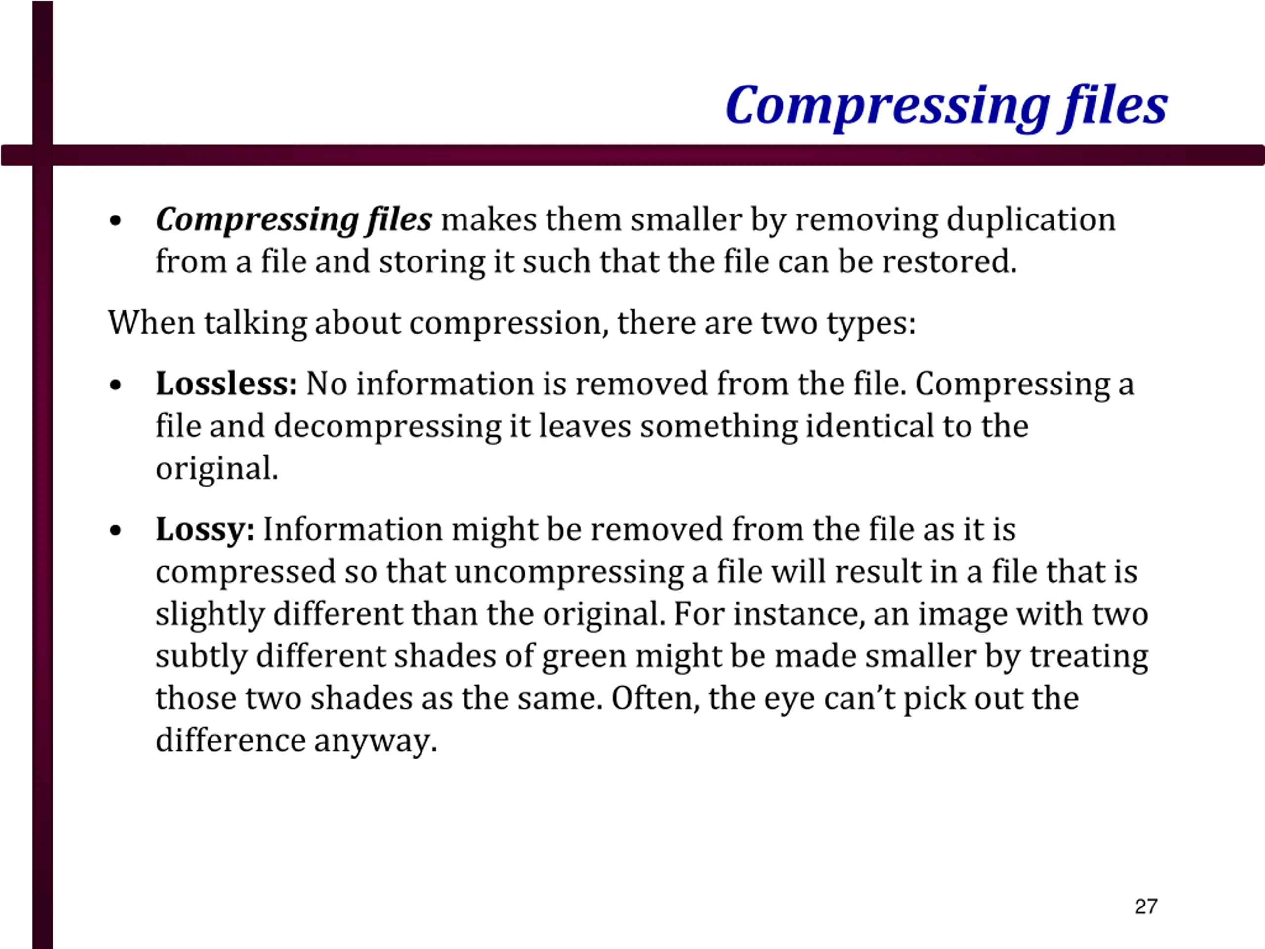 Compressing files Compressing files makes them smaller by removing duplication from a file and storing it such that the file can be restored. When talking about compression, there are two types: Lossless: No information is removed from the file. Compressing a file and decompressing it leaves something identical to the original. Lossy: Information might be removed from the file as it is compressed so that uncompressing a file will result in a file that is slightly different than the original. For instance, an image with two subtly different shades of green might be made smaller by treating those two shades as the same. Often, the eye can t pick out the difference anyway. 27