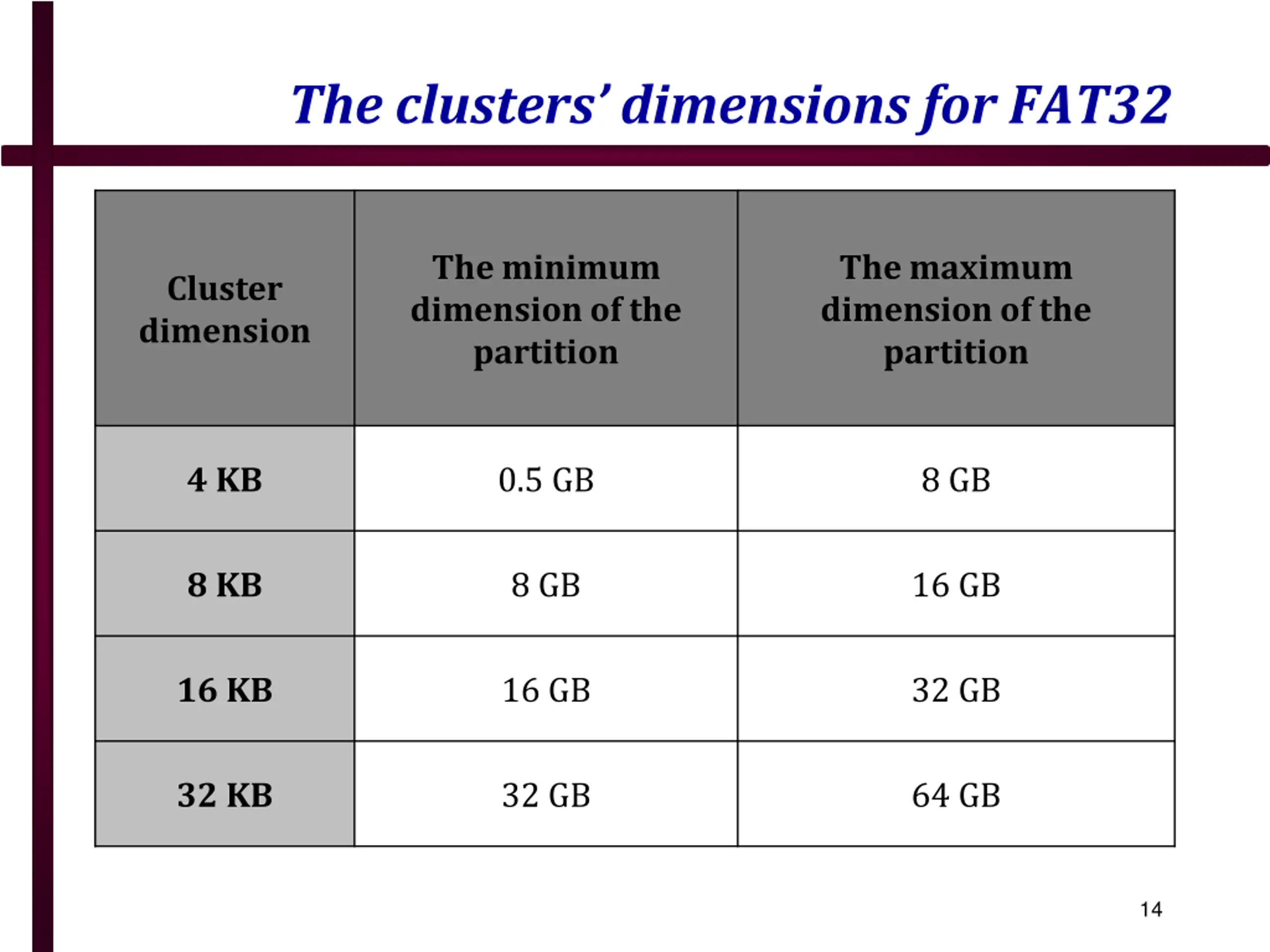 The clusters dimensions for FAT32 The minimum dimension of the partition The maximum dimension of the partition Cluster dimension 4 KB 0.5 GB 8 GB 8 KB 8 GB 16 GB 16 KB 16 GB 32 GB 32 KB 32 GB 64 GB 14