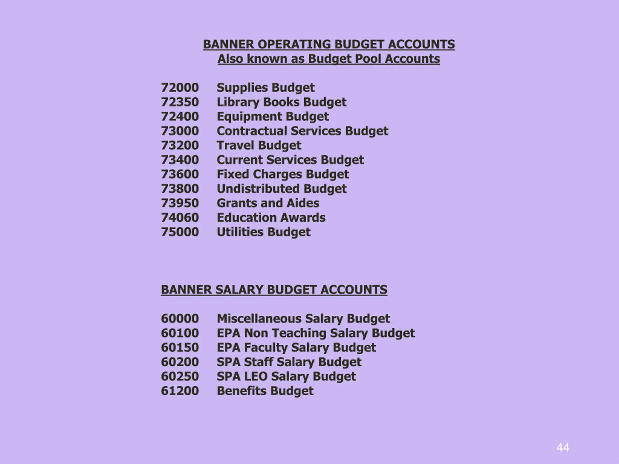 BANNER OPERATING BUDGET ACCOUNTS Also known as Budget Pool Accounts 72000 Supplies Budget 72350 Library Books Budget 72400 Equipment Budget 73000 Contractual Services Budget 73200 Travel Budget 73400 Current Services Budget 73600 Fixed Charges Budget 73800 Undistributed Budget 73950 Grants and Aides 74060 Education Awards 75000 Utilities Budget BANNER SALARY BUDGET ACCOUNTS 60000 Miscellaneous Salary Budget 60100 EPA Non Teaching Salary Budget 60150 EPA Faculty Salary Budget 60200 SPA Staff Salary Budget 60250 SPA LEO Salary Budget 61200 Benefits Budget 44