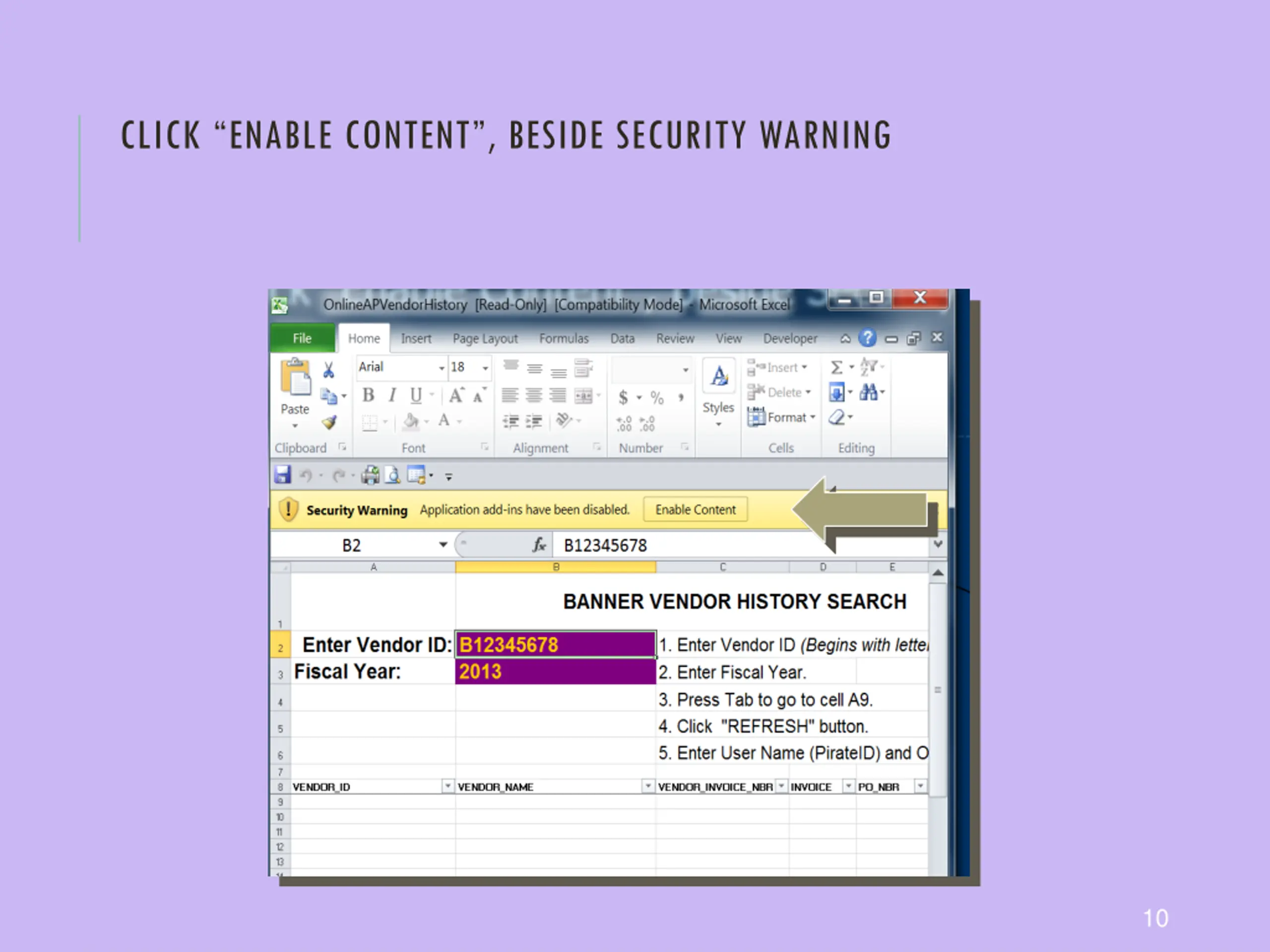 GO TO THE SYSTEMS COORDINATION WEBSITE (HTTPS://FINANCIALSERVICES.ECU.EDU/SYSTEMS-COORDINATION/) Scroll down to the Quick Query List Click Banner Vendor History Search Click Enable Content , beside Security Warning 9
