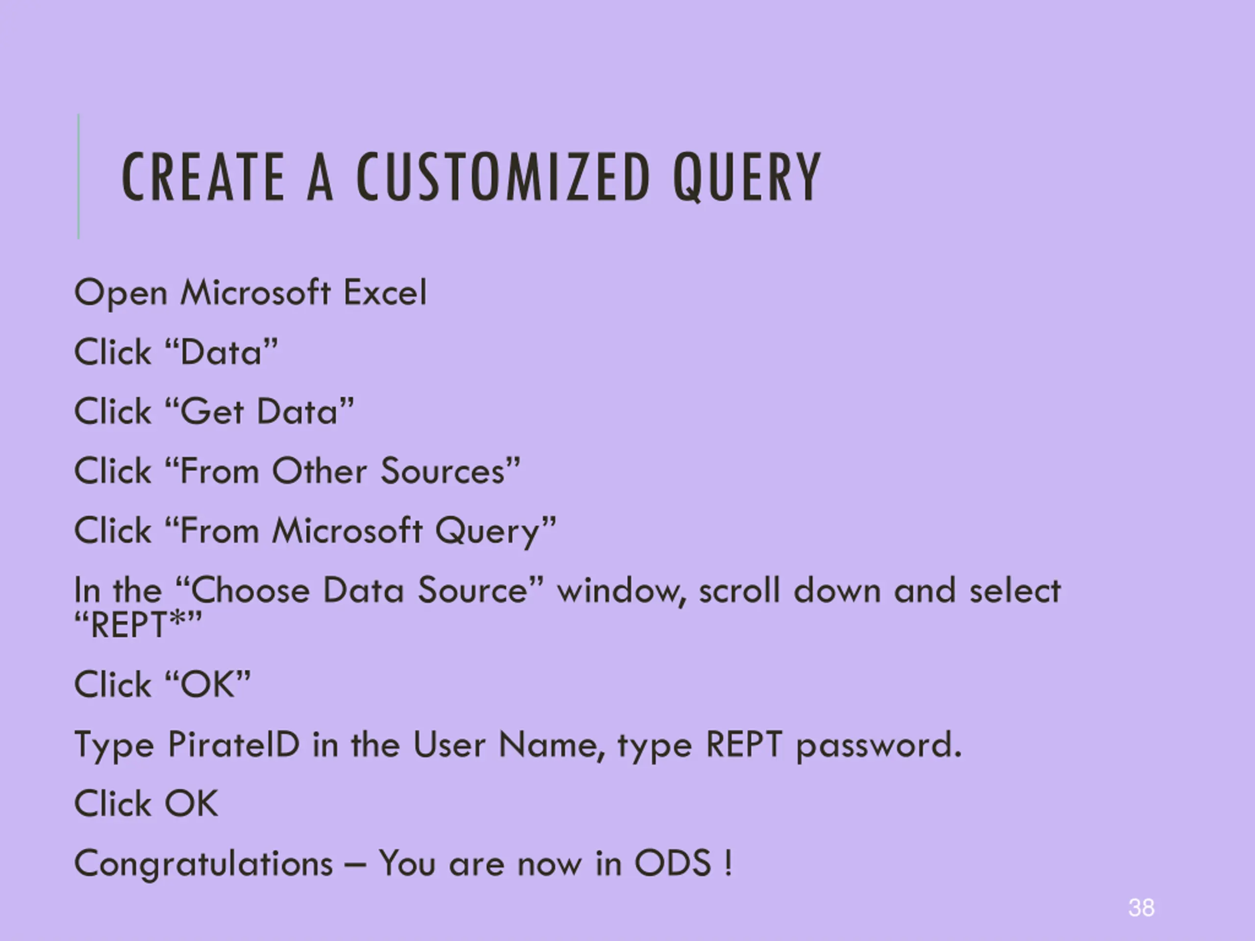 CREATE A CUSTOMIZED QUERY Open Microsoft Excel Click Data Click Get Data Click From Other Sources Click From Microsoft Query In the Choose Data Source window, scroll down and select REPT* Click OK Type PirateID in the User Name, type REPT password. Click OK Congratulations You are now in ODS ! 38