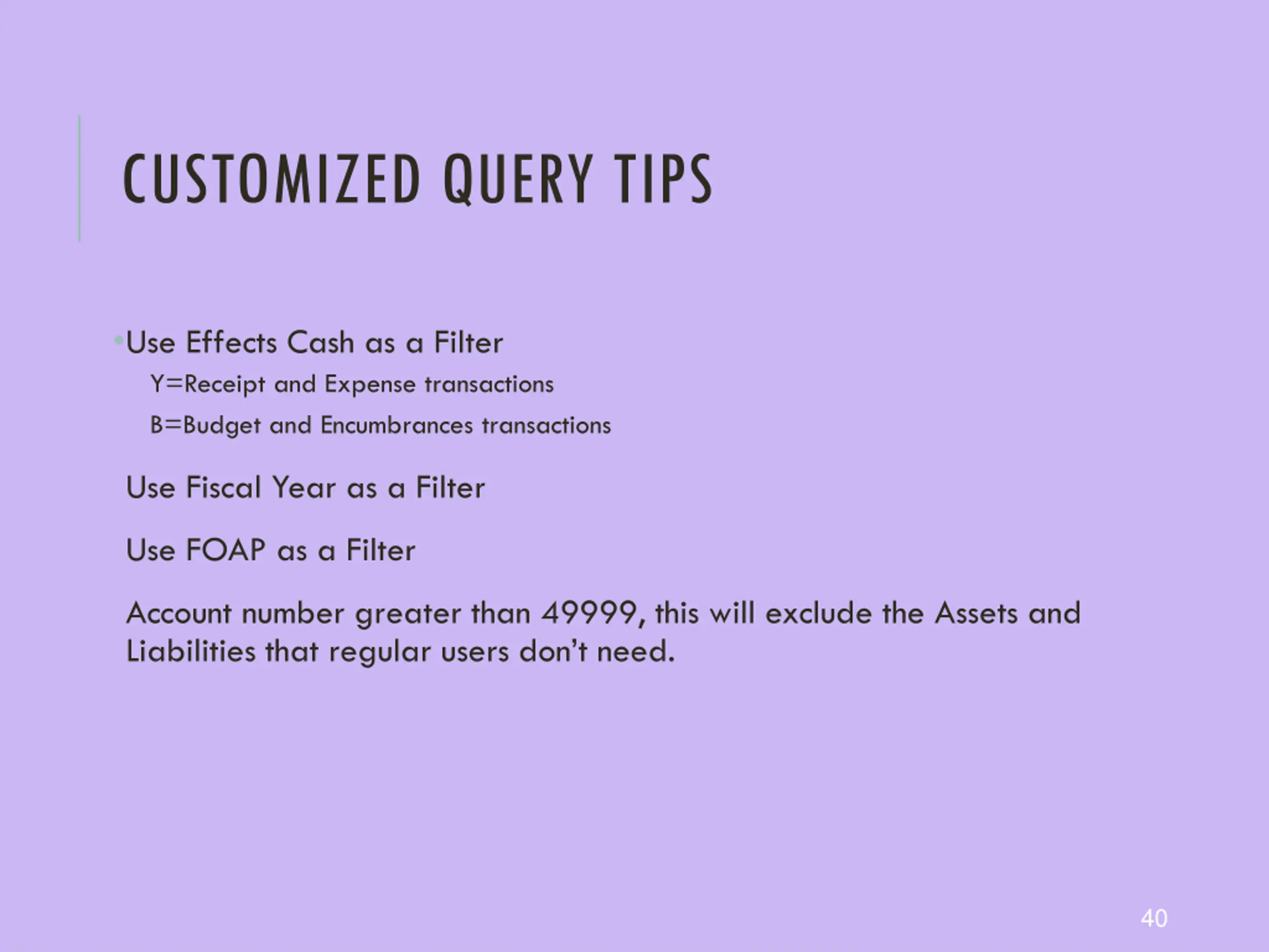 CUSTOMIZED QUERY TIPS Use Effects Cash as a Filter Y=Receipt and Expense transactions B=Budget and Encumbrances transactions Use Fiscal Year as a Filter Use FOAP as a Filter Account number greater than 49999, this will exclude the Assets and Liabilities that regular users don t need. 40