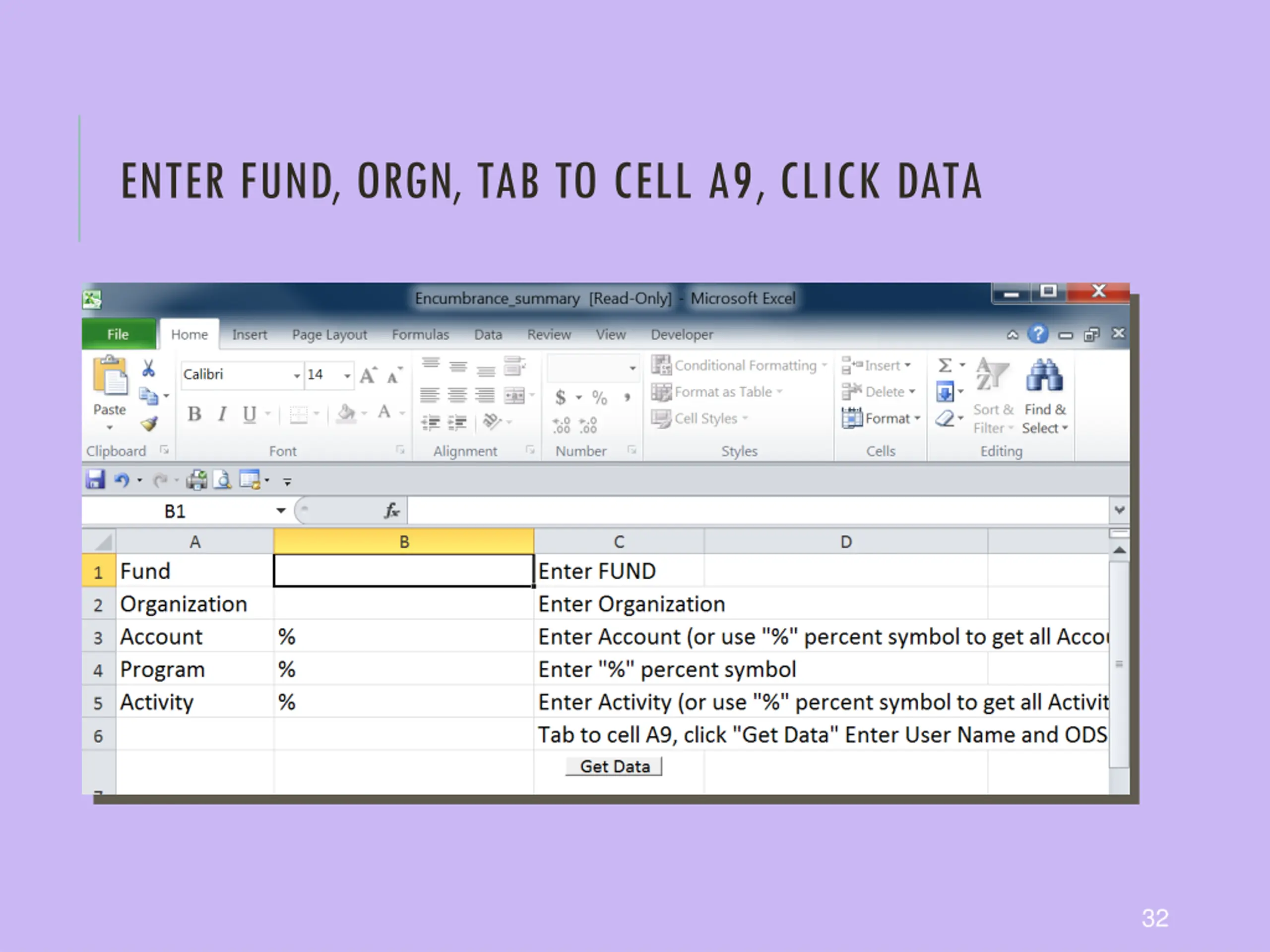 ENTER FUND, ORGN, PROGRAM, FISCAL YEAR AND CALENDAR MONTH, TAB TO CELL A9, CLICK REFRESH 21