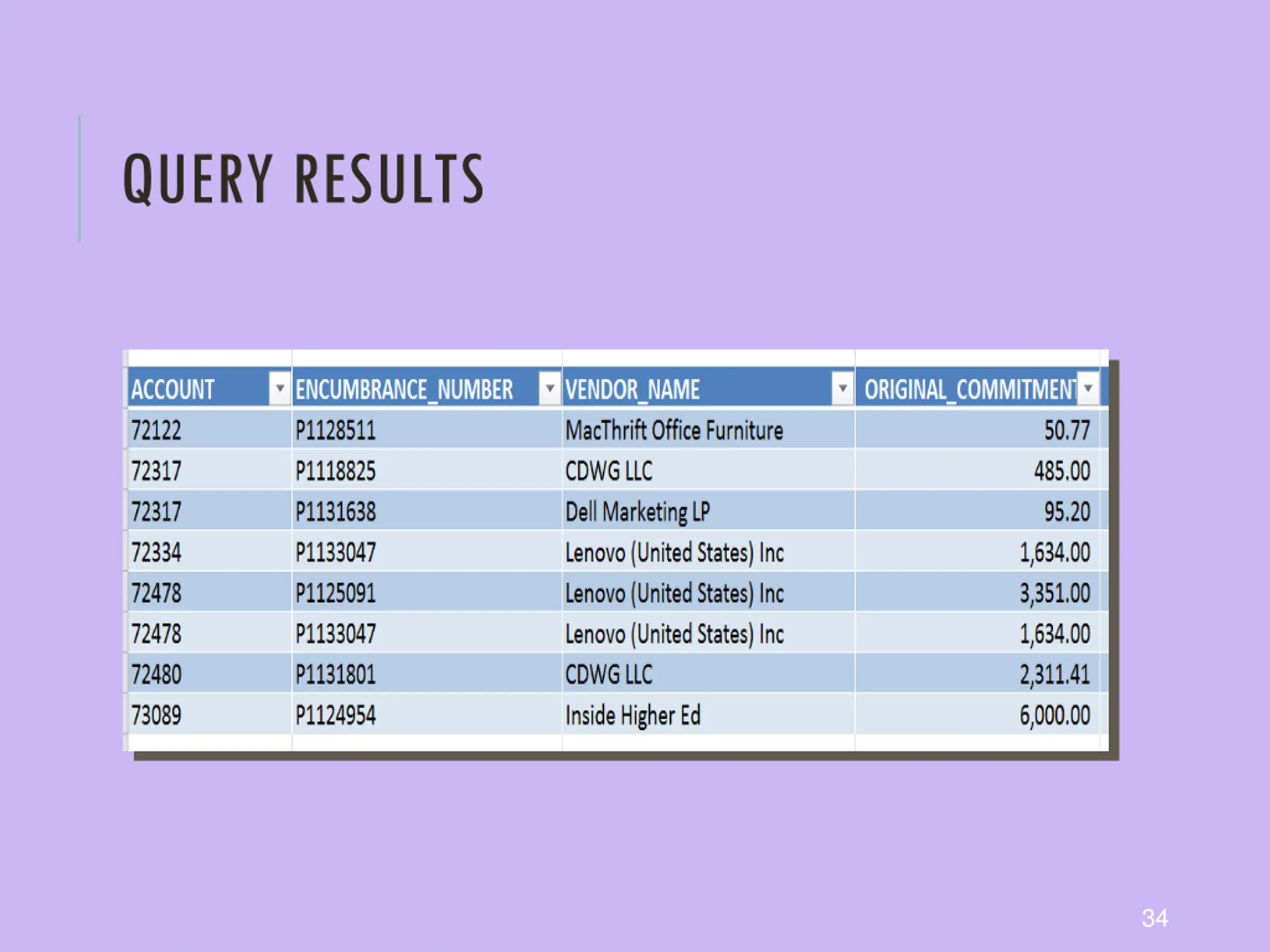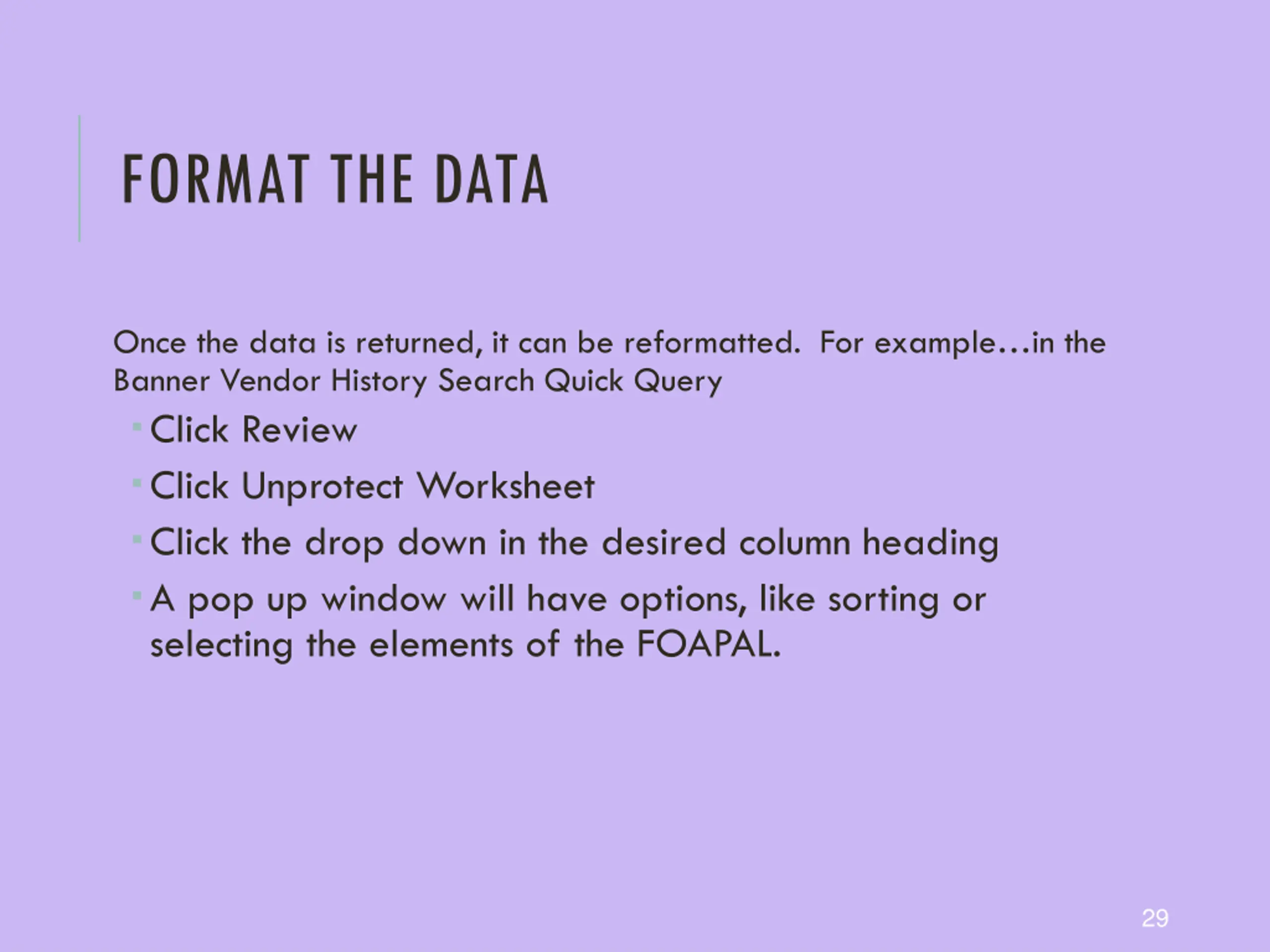 FORMAT THE DATA Once the data is returned, it can be reformatted. For example in the Banner Vendor History Search Quick Query Click Review Click Unprotect Worksheet Click the drop down in the desired column heading A pop up window will have options, like sorting or selecting the elements of the FOAPAL. 29