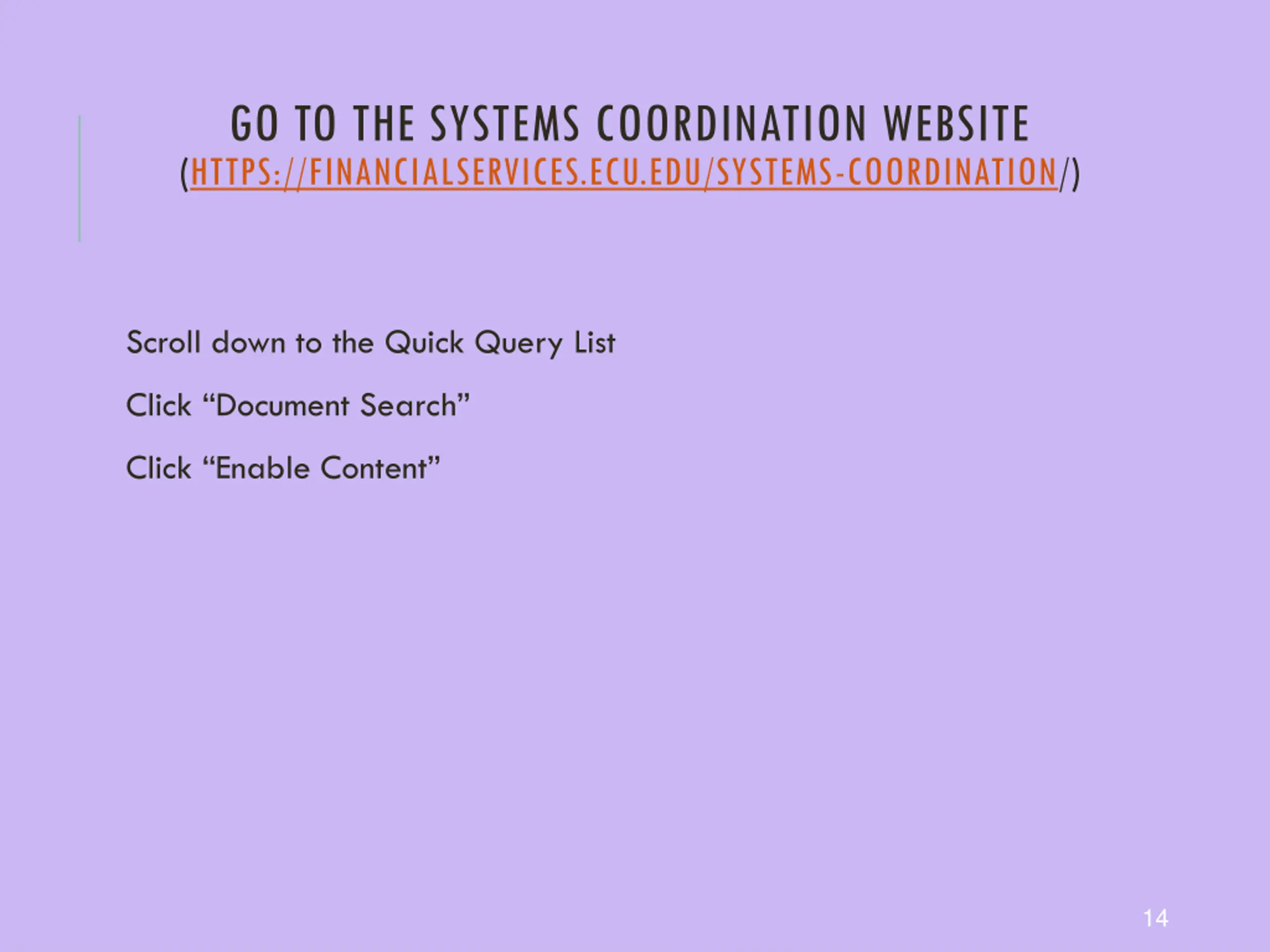 GO TO THE SYSTEMS COORDINATION WEBSITE (HTTPS://FINANCIALSERVICES.ECU.EDU/SYSTEMS-COORDINATION/) Scroll down to the Quick Query List Click Document Search Click Enable Content 14