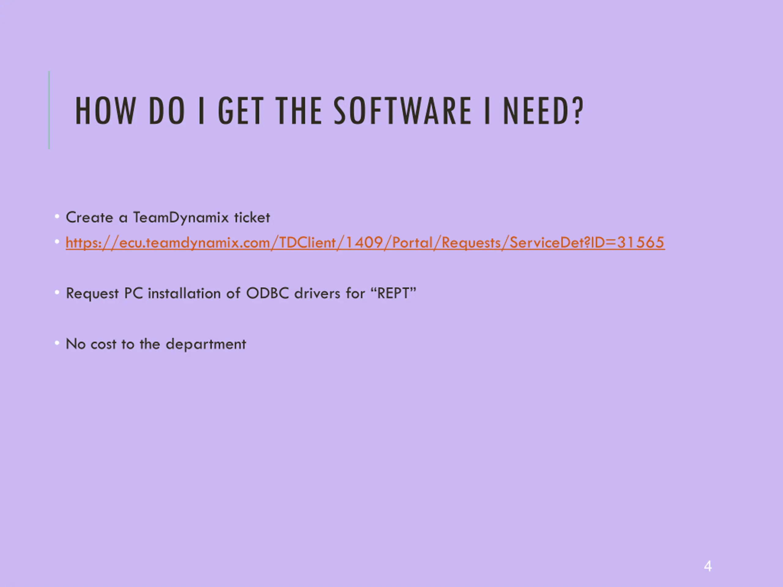 HOW DO I GET THE SOFTWARE I NEED? Create a TeamDynamix ticket https://ecu.teamdynamix.com/TDClient/1409/Portal/Requests/ServiceDet?ID=31565 Request PC installation of ODBC drivers for REPT No cost to the department 4