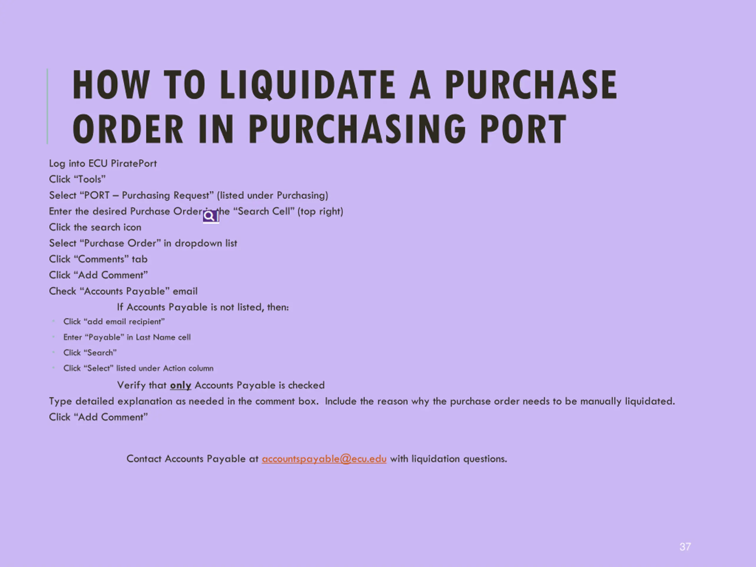 HOW TO LIQUIDATE A PURCHASE ORDER IN PURCHASING PORT Log into ECU PiratePort Click Tools Select PORT Purchasing Request (listed under Purchasing) Enter the desired Purchase Order in the Search Cell (top right) Click the search icon Select Purchase Order in dropdown list Click Comments tab Click Add Comment Check Accounts Payable email If Accounts Payable is not listed, then: Click add email recipient Enter Payable in Last Name cell Click Search Click Select listed under Action column Verify that only Accounts Payable is checked Type detailed explanation as needed in the comment box. Include the reason why the purchase order needs to be manually liquidated. Click Add Comment Contact Accounts Payable at accountspayable@ecu.edu with liquidation questions. 37