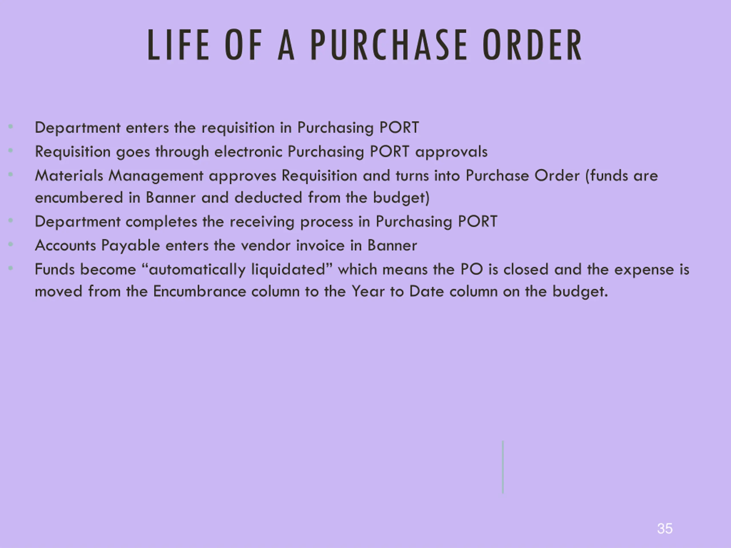 LIFE OF A PURCHASE ORDER Department enters the requisition in Purchasing PORT Requisition goes through electronic Purchasing PORT approvals Materials Management approves Requisition and turns into Purchase Order (funds are encumbered in Banner and deducted from the budget) Department completes the receiving process in Purchasing PORT Accounts Payable enters the vendor invoice in Banner Funds become automatically liquidated which means the PO is closed and the expense is moved from the Encumbrance column to the Year to Date column on the budget. 35