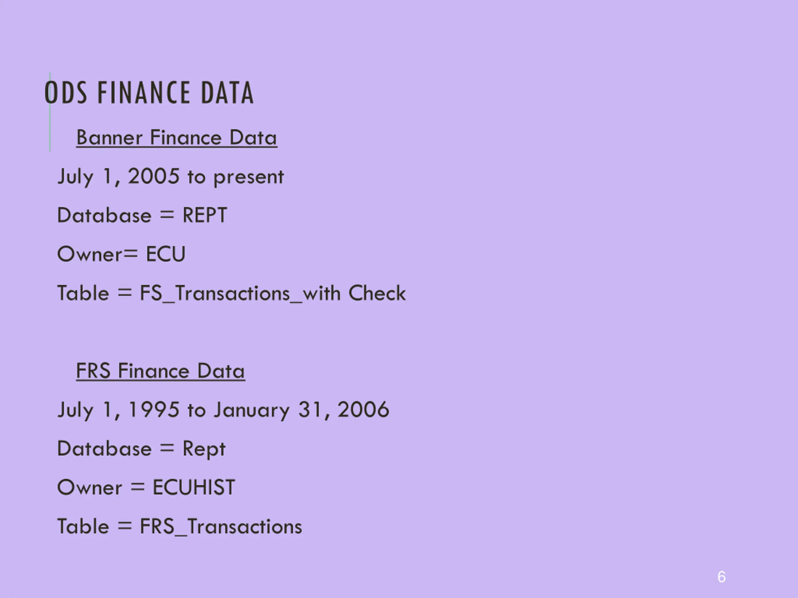 ODS FINANCE DATA Banner Finance Data July 1, 2005 to present Database = REPT Owner= ECU Table = FS_Transactions_with Check FRS Finance Data July 1, 1995 to January 31, 2006 Database = Rept Owner = ECUHIST Table = FRS_Transactions 6