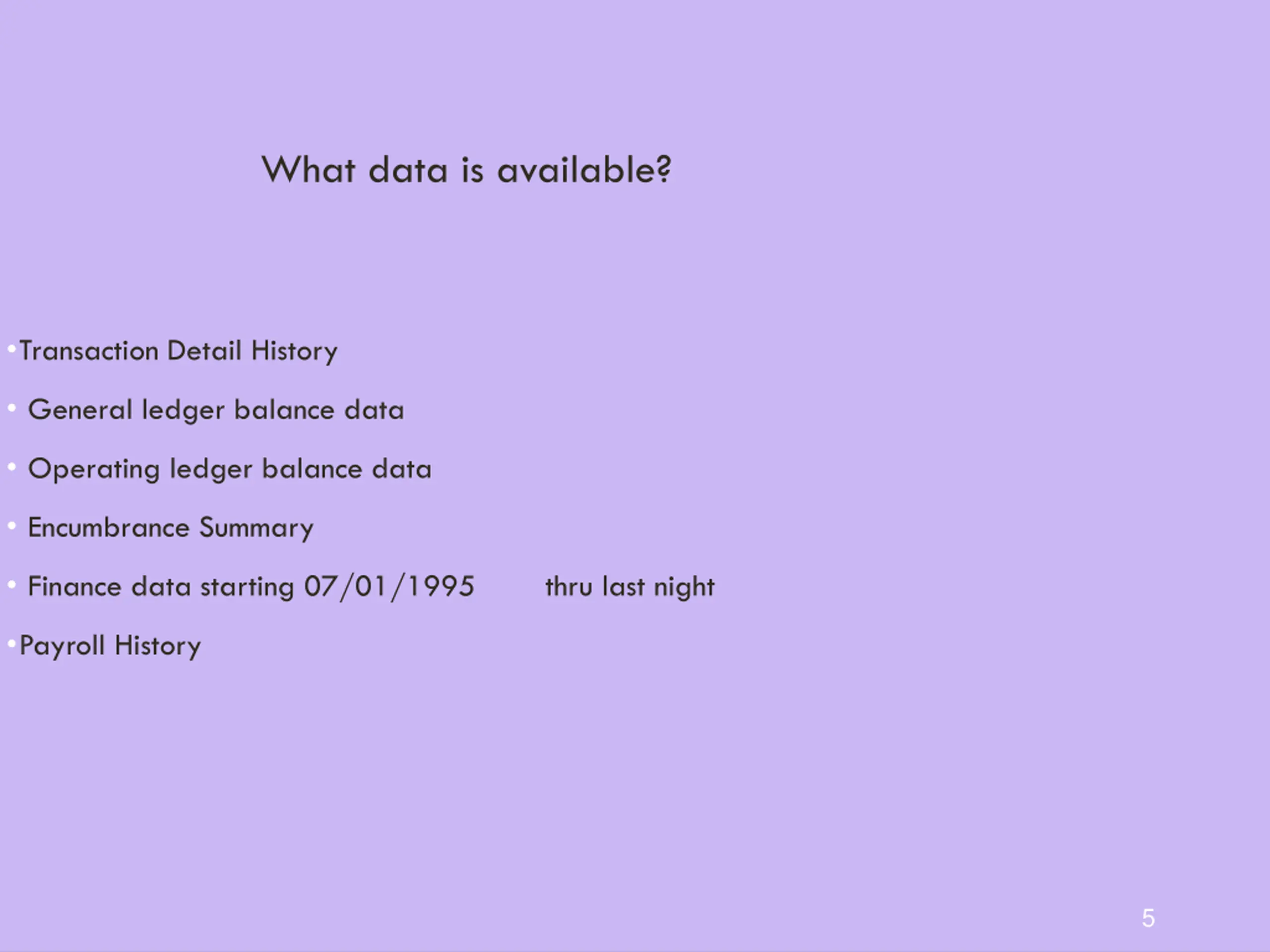 ODS FINANCE DATA What data is available? Transaction Detail History General ledger balance data Operating ledger balance data Encumbrance Summary Finance data starting 07/01/1995 thru last night Payroll History 5