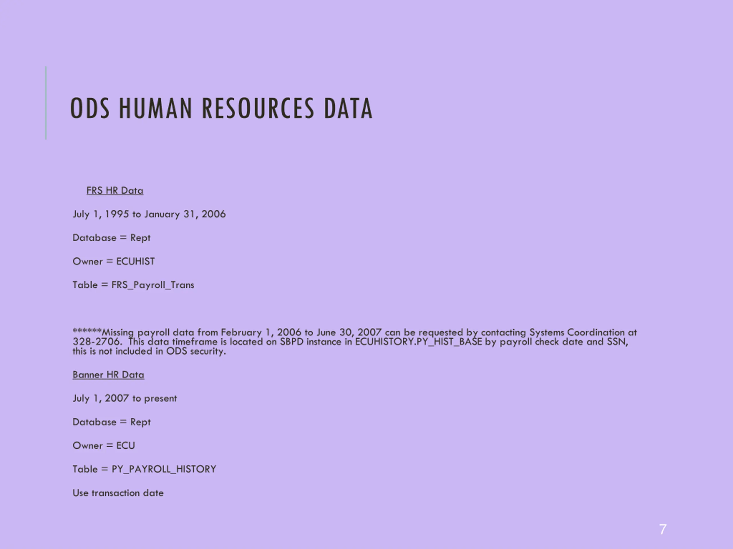 ODS HUMAN RESOURCES DATA FRS HR Data July 1, 1995 to January 31, 2006 Database = Rept Owner = ECUHIST Table = FRS_Payroll_Trans ******Missing payroll data from February 1, 2006 to June 30, 2007 can be requested by contacting Systems Coordination at 328-2706. This data timeframe is located on SBPD instance in ECUHISTORY.PY_HIST_BASE by payroll check date and SSN, this is not included in ODS security. Banner HR Data July 1, 2007 to present Database = Rept Owner = ECU Table = PY_PAYROLL_HISTORY Use transaction date 7