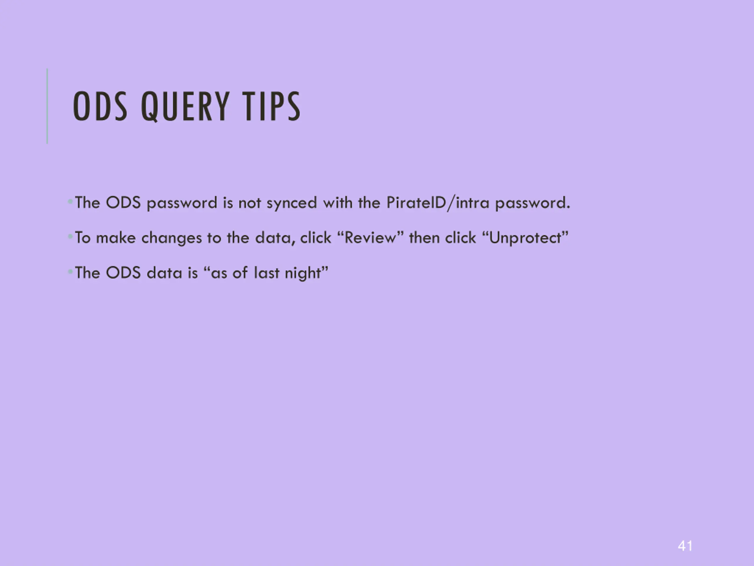 ODS QUERY TIPS The ODS password is not synced with the PirateID/intra password. To make changes to the data, click Review then click Unprotect The ODS data is as of last night 41