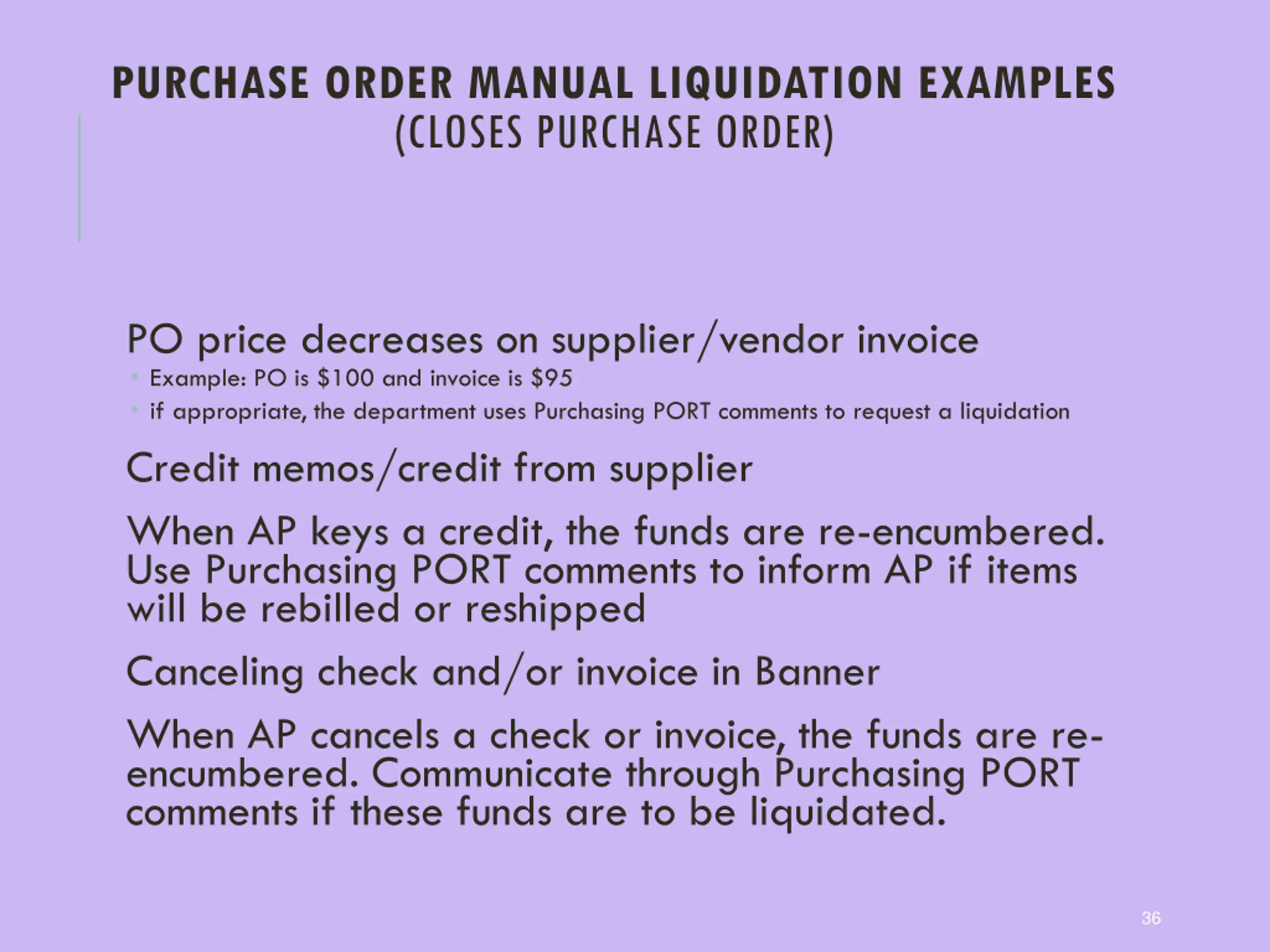 PURCHASE ORDER MANUAL LIQUIDATION EXAMPLES (CLOSES PURCHASE ORDER) PO price decreases on supplier/vendor invoice Example: PO is $100 and invoice is $95 if appropriate, the department uses Purchasing PORT comments to request a liquidation Credit memos/credit from supplier When AP keys a credit, the funds are re-encumbered. Use Purchasing PORT comments to inform AP if items will be rebilled or reshipped Canceling check and/or invoice in Banner When AP cancels a check or invoice, the funds are re- encumbered. Communicate through Purchasing PORT comments if these funds are to be liquidated. 36