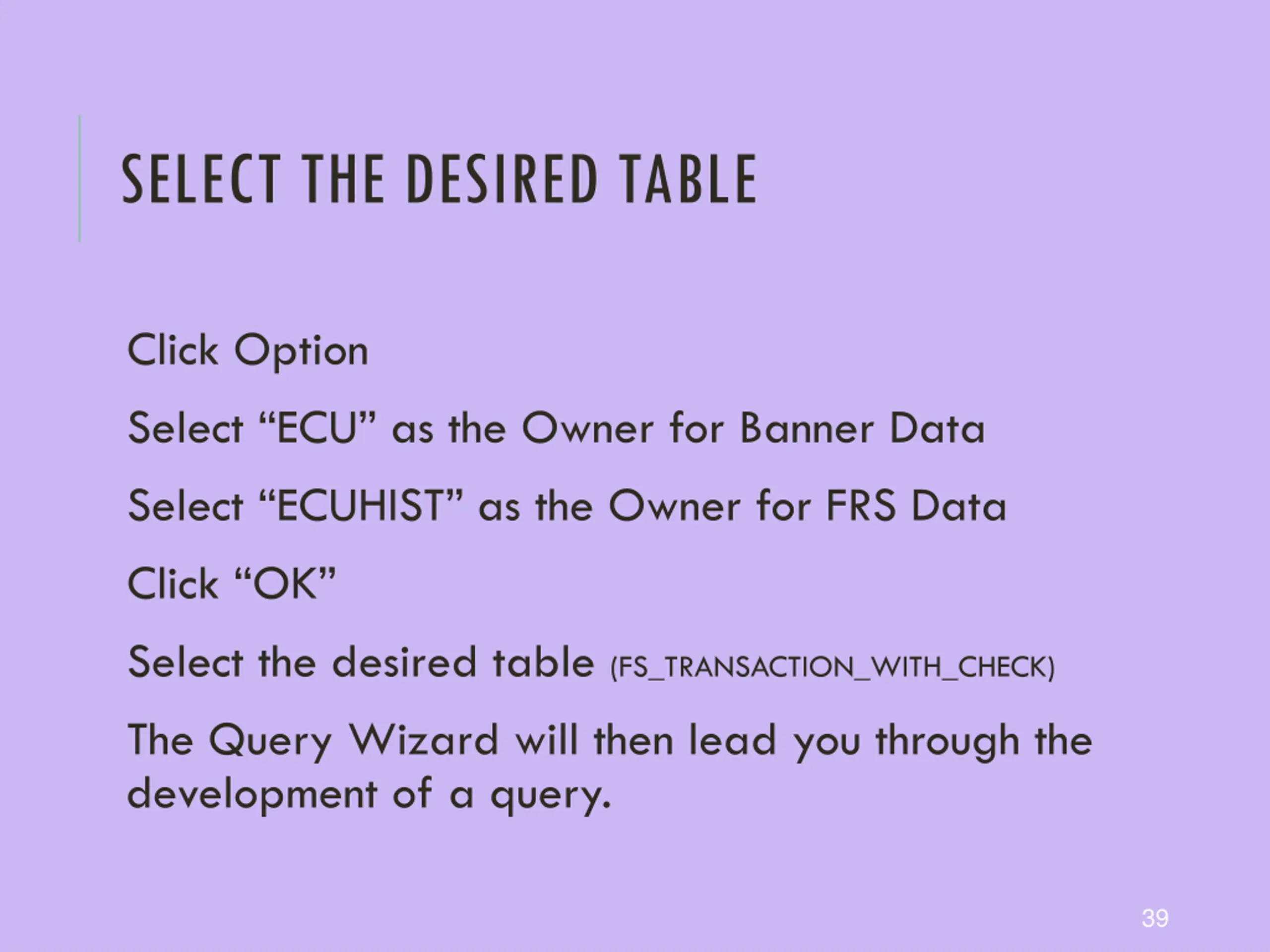SELECT THE DESIRED TABLE Click Option Select ECU as the Owner for Banner Data Select ECUHIST as the Owner for FRS Data Click OK Select the desired table (FS_TRANSACTION_WITH_CHECK) The Query Wizard will then lead you through the development of a query. 39