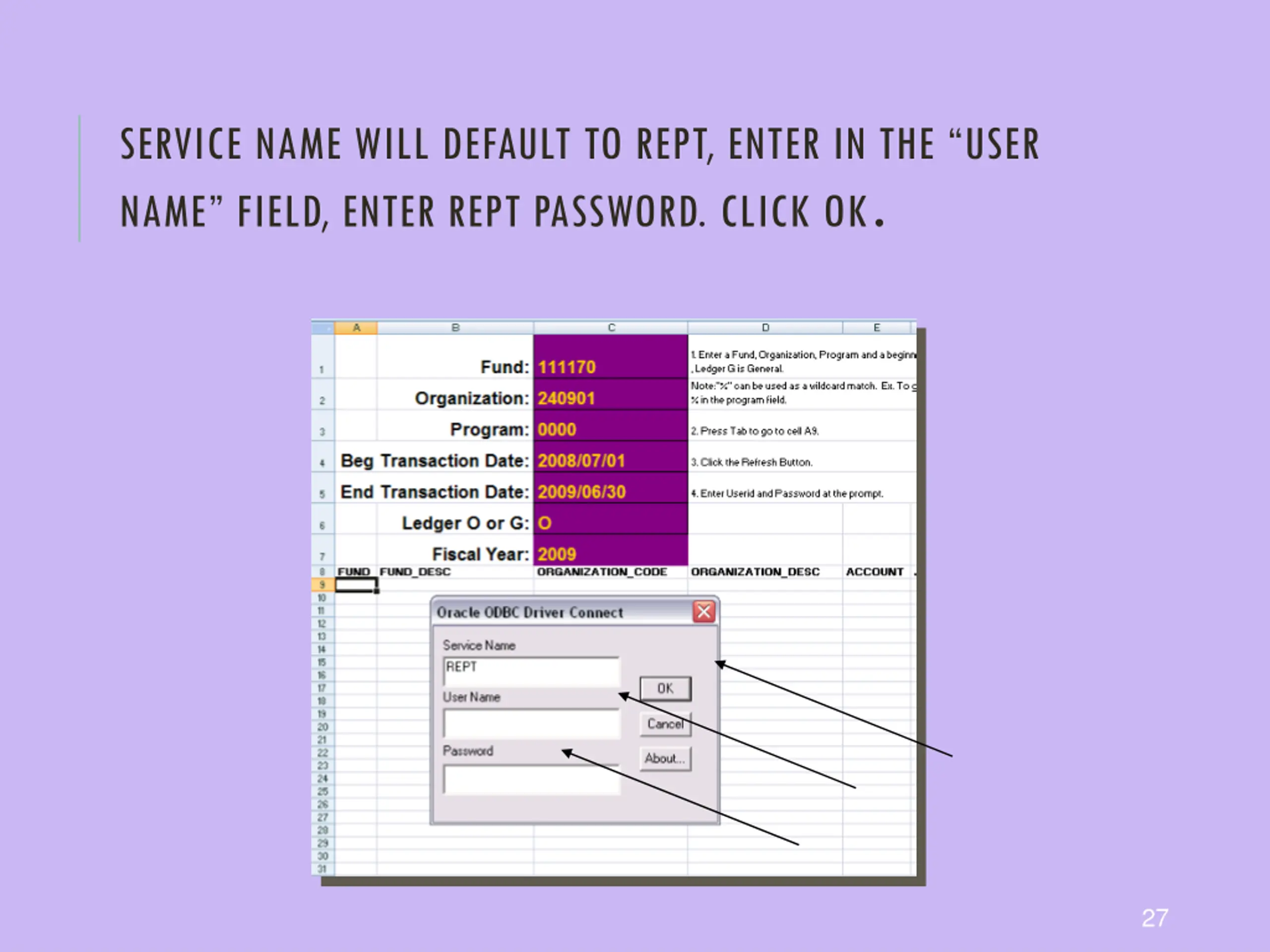 SERVICE NAME WILL DEFAULT TO REPT, ENTER IN THE USER NAME FIELD, ENTER REPT PASSWORD. CLICK OK. 27