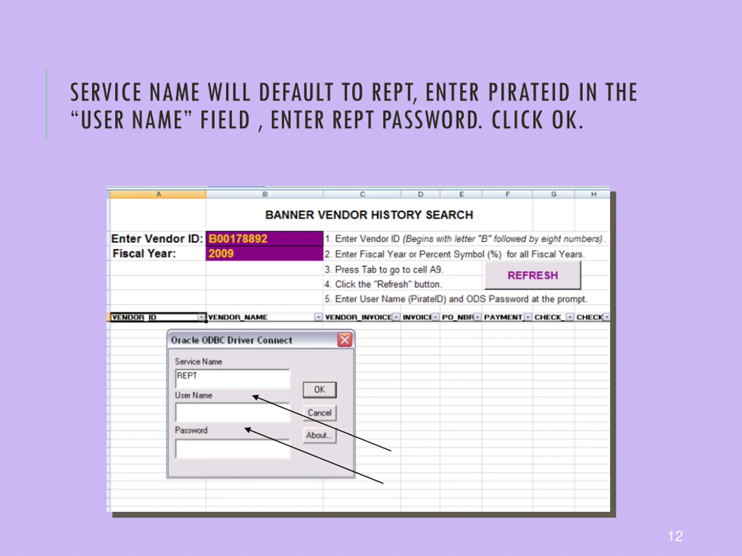 SERVICE NAME WILL DEFAULT TO REPT, ENTER PIRATEID IN THE USER NAME FIELD , ENTER REPT PASSWORD. CLICK OK. 12