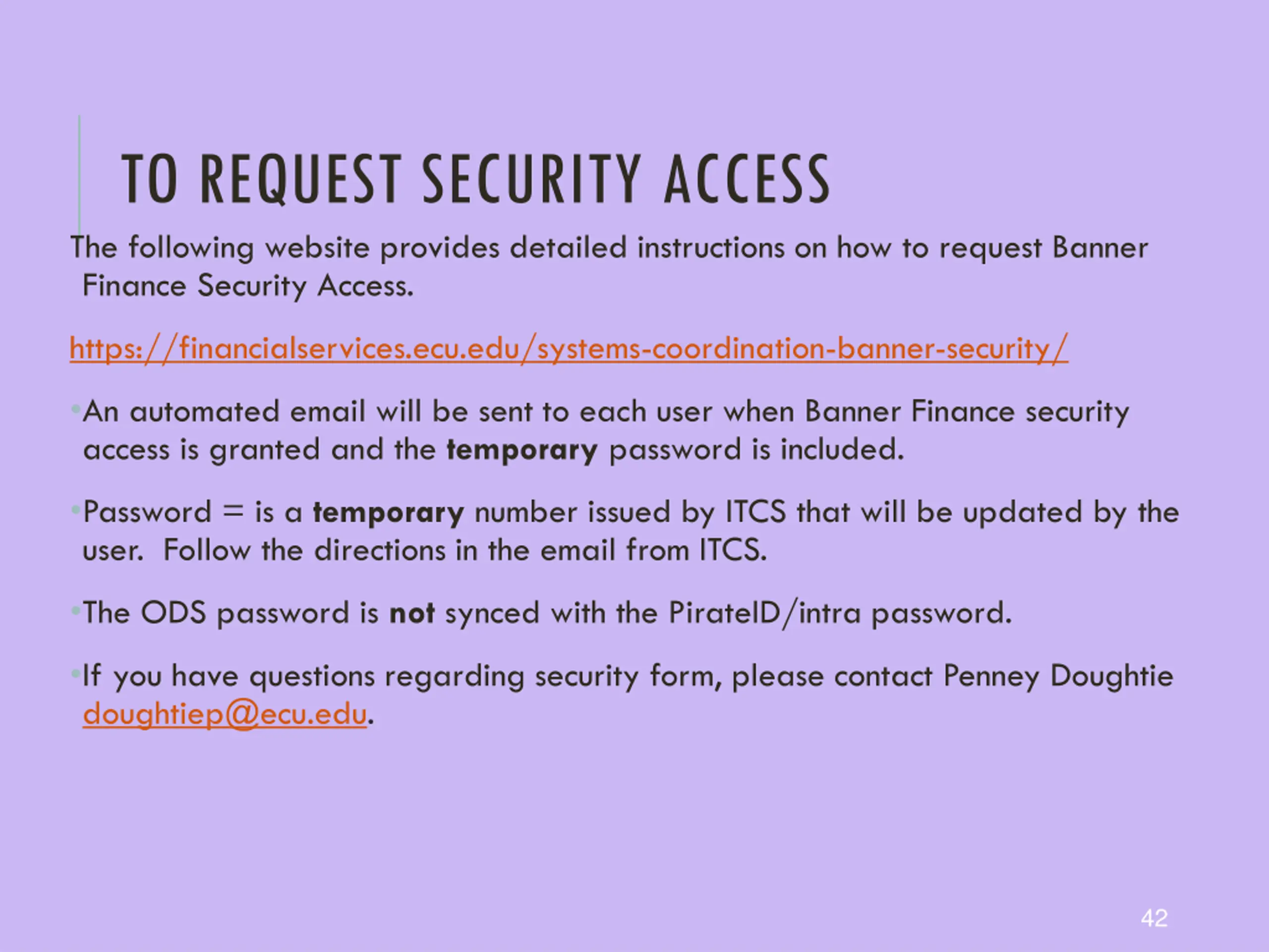 TO REQUEST SECURITY ACCESS The following website provides detailed instructions on how to request Banner Finance Security Access. https://financialservices.ecu.edu/systems-coordination-banner-security/ An automated email will be sent to each user when Banner Finance security access is granted and the temporary password is included. Password = is a temporary number issued by ITCS that will be updated by the user. Follow the directions in the email from ITCS. The ODS password is not synced with the PirateID/intra password. If you have questions regarding security form, please contact Penney Doughtie doughtiep@ecu.edu. 42