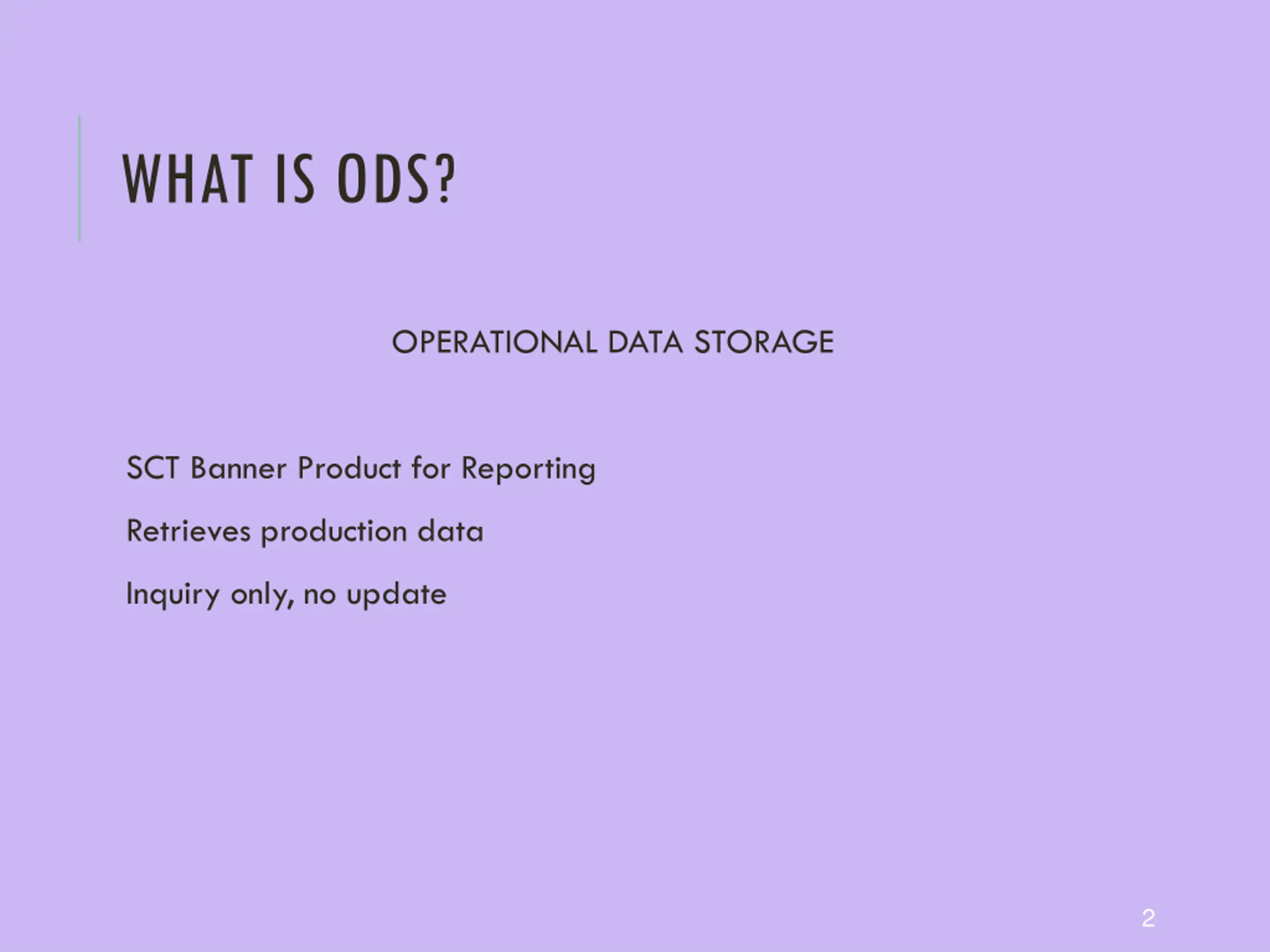 WHAT IS ODS? OPERATIONAL DATA STORAGE SCT Banner Product for Reporting Retrieves production data Inquiry only, no update 2