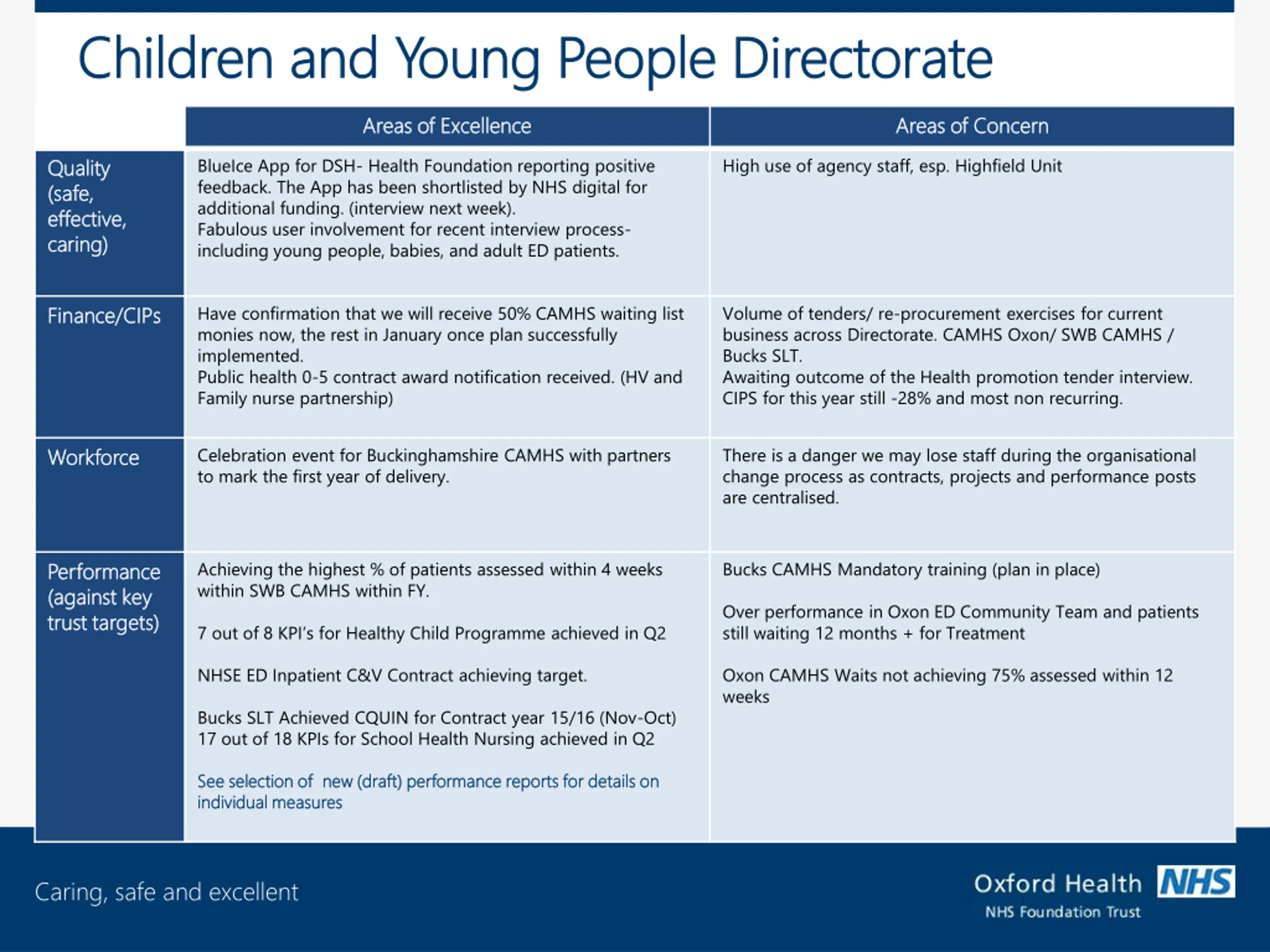 Children and Young People Directorate Children and Young People Directorate Areas Areas of Excellence of Excellence Areas Areas of Concern of Concern Quality Quality (safe, (safe, effective, effective, caring) caring) BlueIce App for DSH- Health Foundation reporting positive feedback. The App has been shortlisted by NHS digital for additional funding. (interview next week). Fabulous user involvement for recent interview process- including young people, babies, and adult ED patients. High use of agency staff, esp. Highfield Unit Finance/CIPs Finance/CIPs Have confirmation that we will receive 50% CAMHS waiting list monies now, the rest in January once plan successfully implemented. Public health 0-5 contract award notification received. (HV and Family nurse partnership) Volume of tenders/ re-procurement exercises for current business across Directorate. CAMHS Oxon/ SWB CAMHS / Bucks SLT. Awaiting outcome of the Health promotion tender interview. CIPS for this year still -28% and most non recurring. Workforce Workforce Celebration event for Buckinghamshire CAMHS with partners to mark the first year of delivery. There is a danger we may lose staff during the organisational change process as contracts, projects and performance posts are centralised. Performance Performance (against (against key trust targets) trust targets) Achieving the highest % of patients assessed within 4 weeks within SWB CAMHS within FY. Bucks CAMHS Mandatory training (plan in place) key Over performance in Oxon ED Community Team and patients still waiting 12 months + for Treatment 7 out of 8 KPI s for Healthy Child Programme achieved in Q2 NHSE ED Inpatient C&V Contract achieving target. Oxon CAMHS Waits not achieving 75% assessed within 12 weeks Bucks SLT Achieved CQUIN for Contract year 15/16 (Nov-Oct) 17 out of 18 KPIs for School Health Nursing achieved in Q2 See selection of new (draft) performance reports for details on See selection of new (draft) performance reports for details on individual measures individual measures Caring, safe and excellent