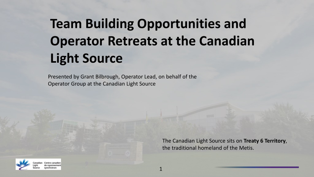 Team Building Opportunities and Operator Retreats at the Canadian Light Source Presented by Grant Bilbrough, Operator Lead, on behalf of the Operator Group at the Canadian Light Source The Canadian Light Source sits on Treaty 6 Territory, the traditional homeland of the Metis. 1