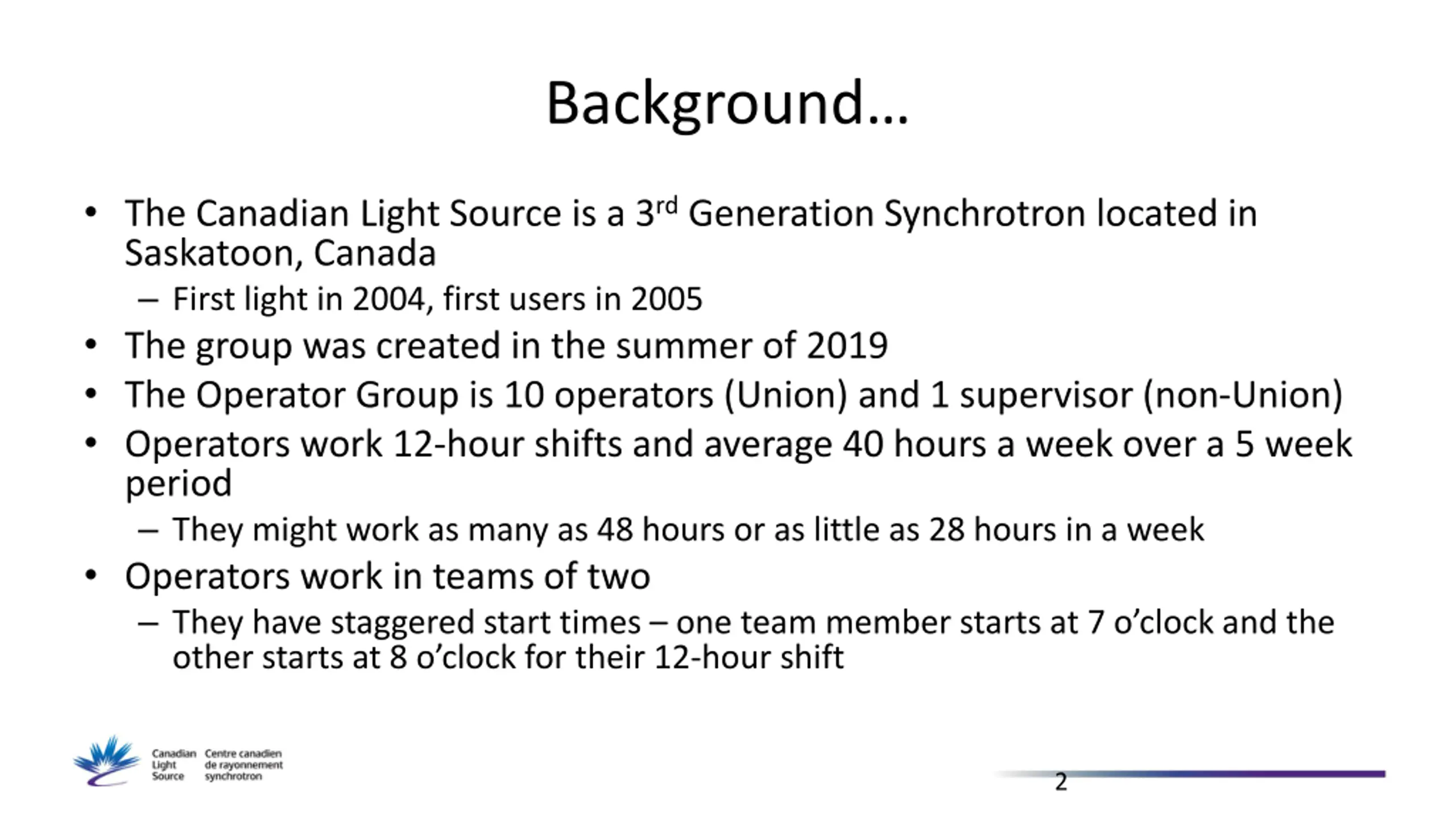 Background The Canadian Light Source is a 3rd Generation Synchrotron located in Saskatoon, Canada First light in 2004, first users in 2005 The group was created in the summer of 2019 The Operator Group is 10 operators (Union) and 1 supervisor (non-Union) Operators work 12-hour shifts and average 40 hours a week over a 5 week period They might work as many as 48 hours or as little as 28 hours in a week Operators work in teams of two They have staggered start times one team member starts at 7 o clock and the other starts at 8 o clock for their 12-hour shift 2