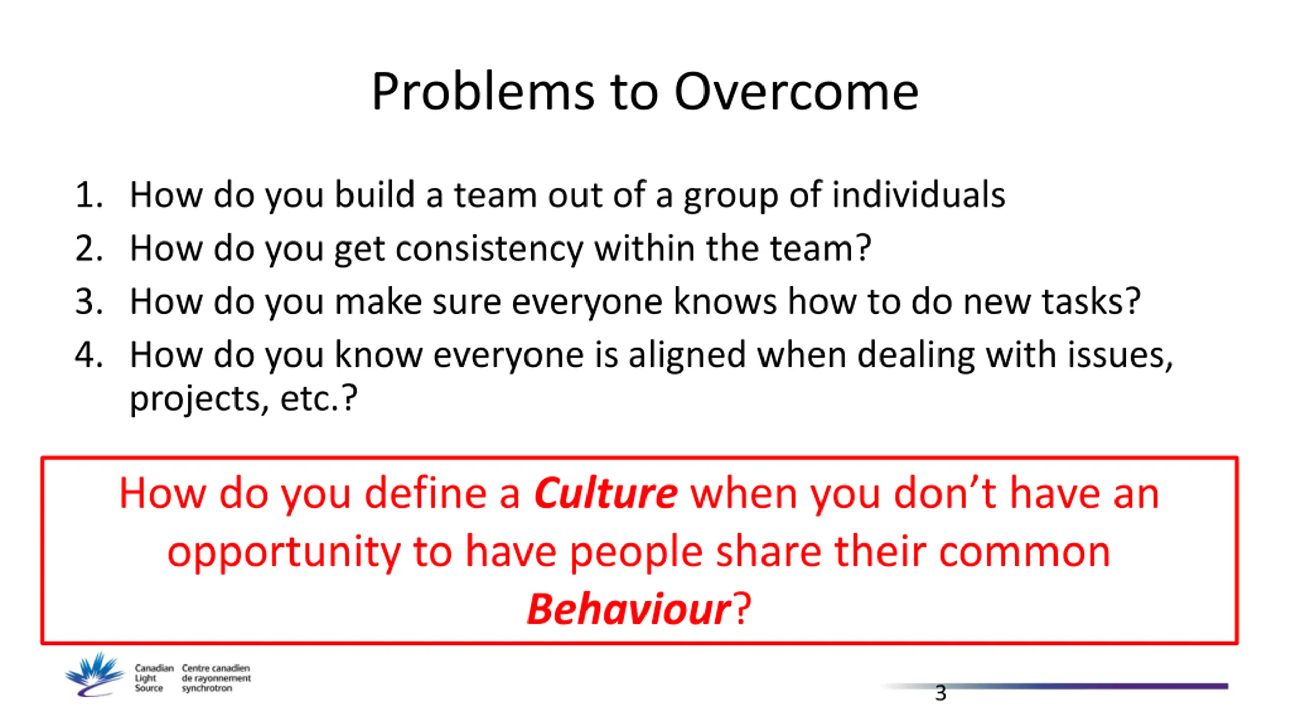 Problems to Overcome 1. How do you build a team out of a group of individuals 2. How do you get consistency within the team? 3. How do you make sure everyone knows how to do new tasks? 4. How do you know everyone is aligned when dealing with issues, projects, etc.? How do you define a Culturewhen you don t have an opportunity to have people share their common Behaviour? 3