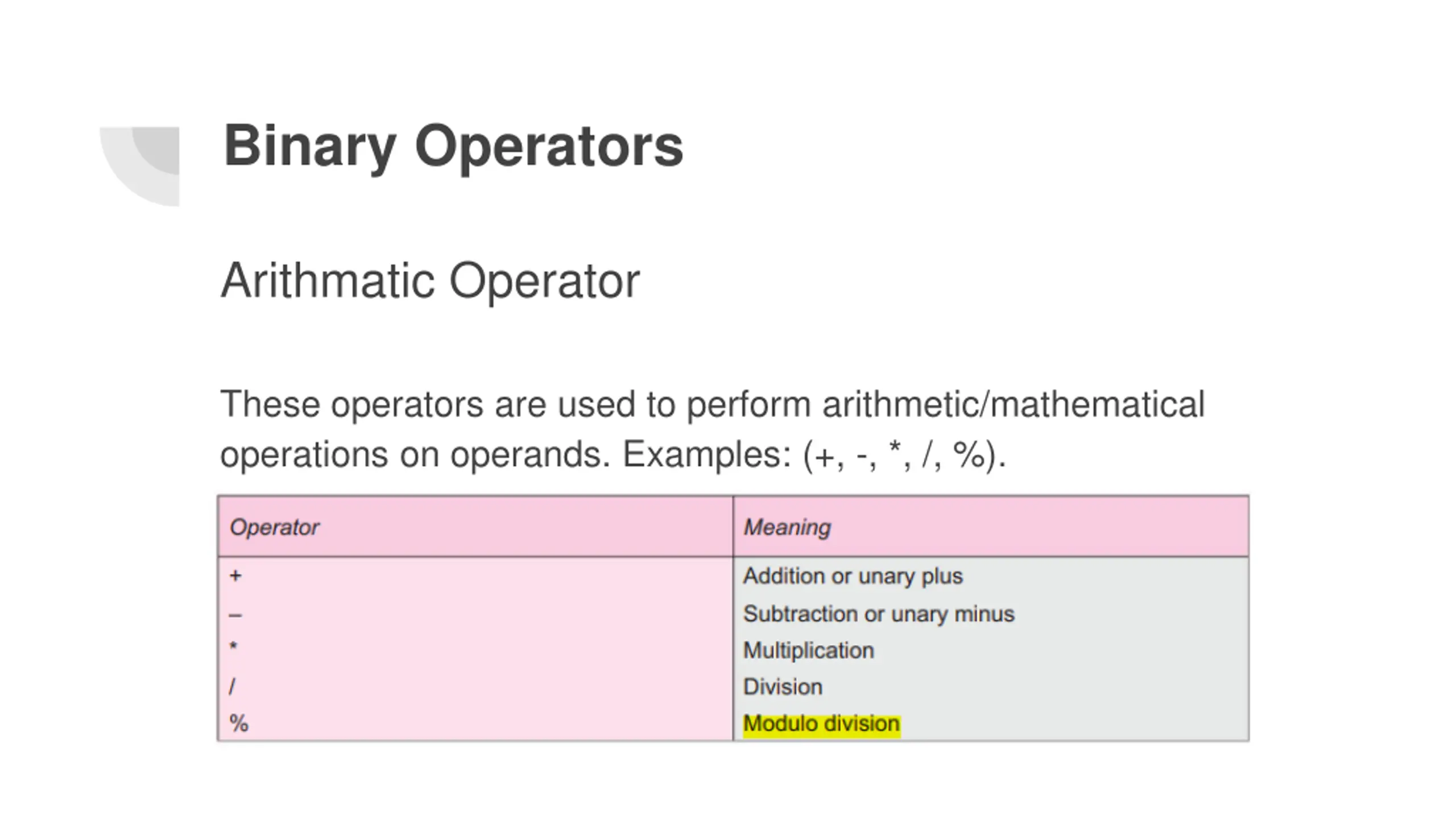 Binary Operators Arithmatic Operator These operators are used to perform arithmetic/mathematical operations on operands. Examples: (+, -, *, /, %).