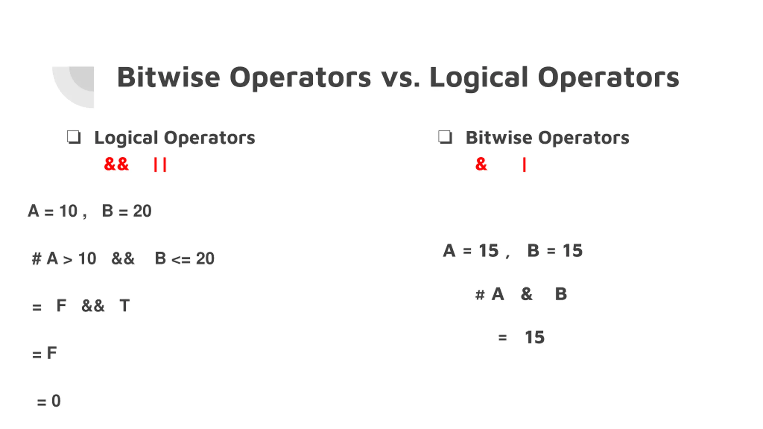 Bitwise Operators vs. Logical Operators Logical Operators && || Bitwise Operators & | A = 10 , B = 20 A = 15 , B = 15 # A > 10 && B <= 20 # A & B = F && T = 15 = F = 0
