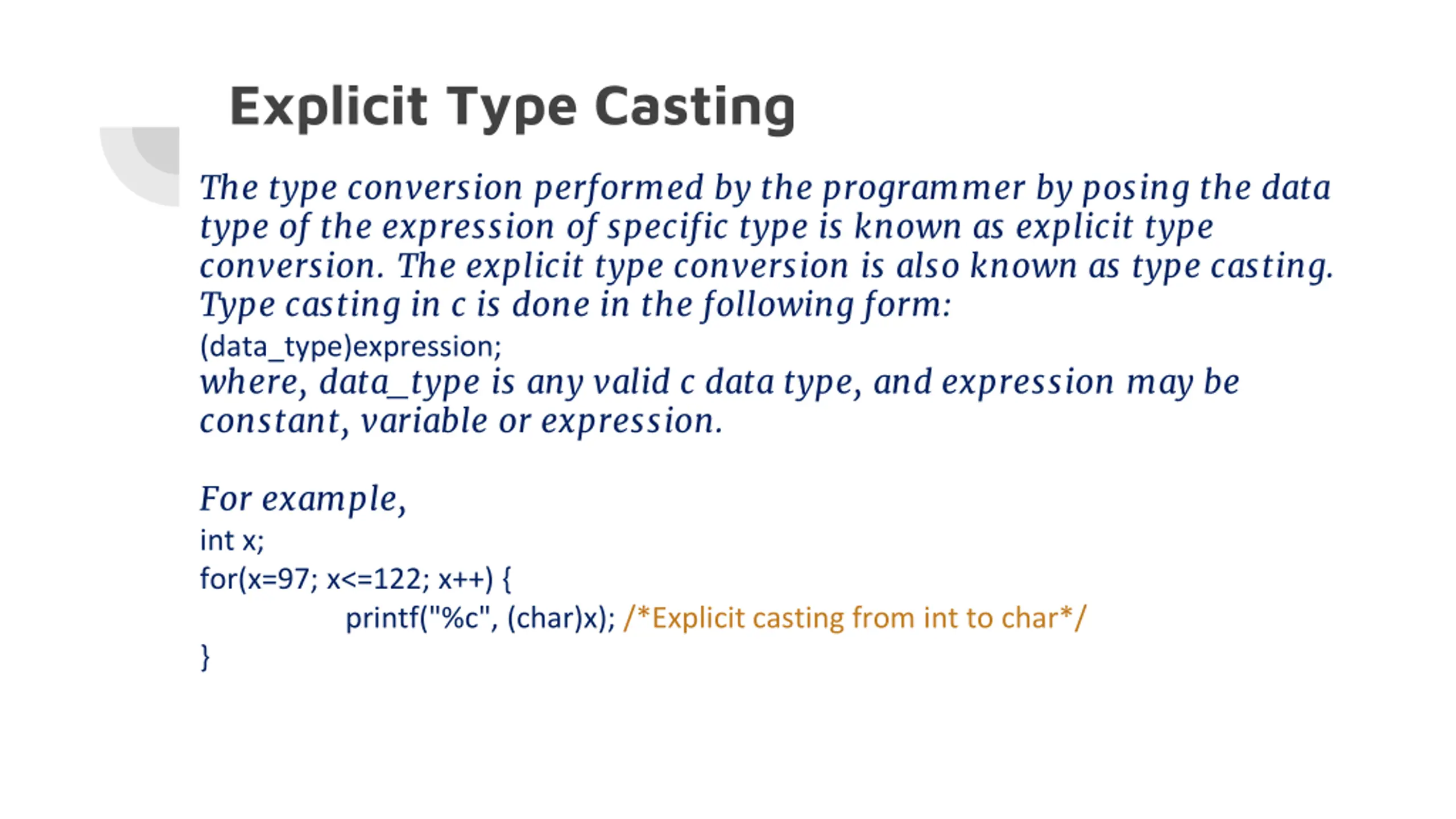 Explicit Type Casting The type conversion performed by the programmer by posing the data type of the expression of specific type is known as explicit type conversion. The explicit type conversion is also known as type casting. Type casting in c is done in the following form: (data_type)expression; where, data_type is any valid c data type, and expression may be constant, variable or expression. For example, int x; for(x=97; x<=122; x++) { printf("%c", (char)x); /*Explicit casting from int to char*/ }
