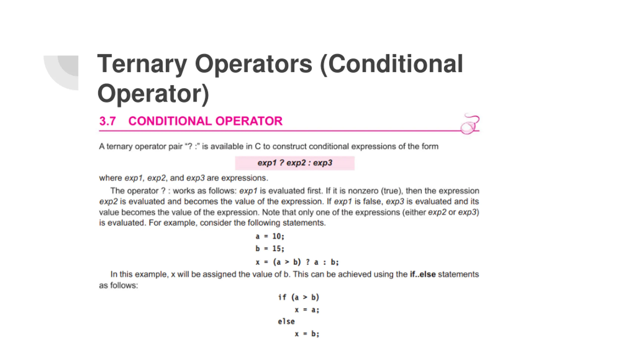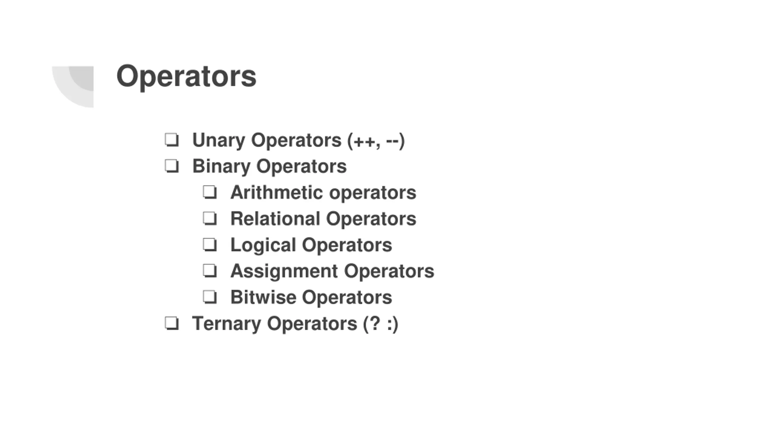 Operators Unary Operators (++, --) Binary Operators Arithmetic operators Relational Operators Logical Operators Assignment Operators Bitwise Operators Ternary Operators (? :)