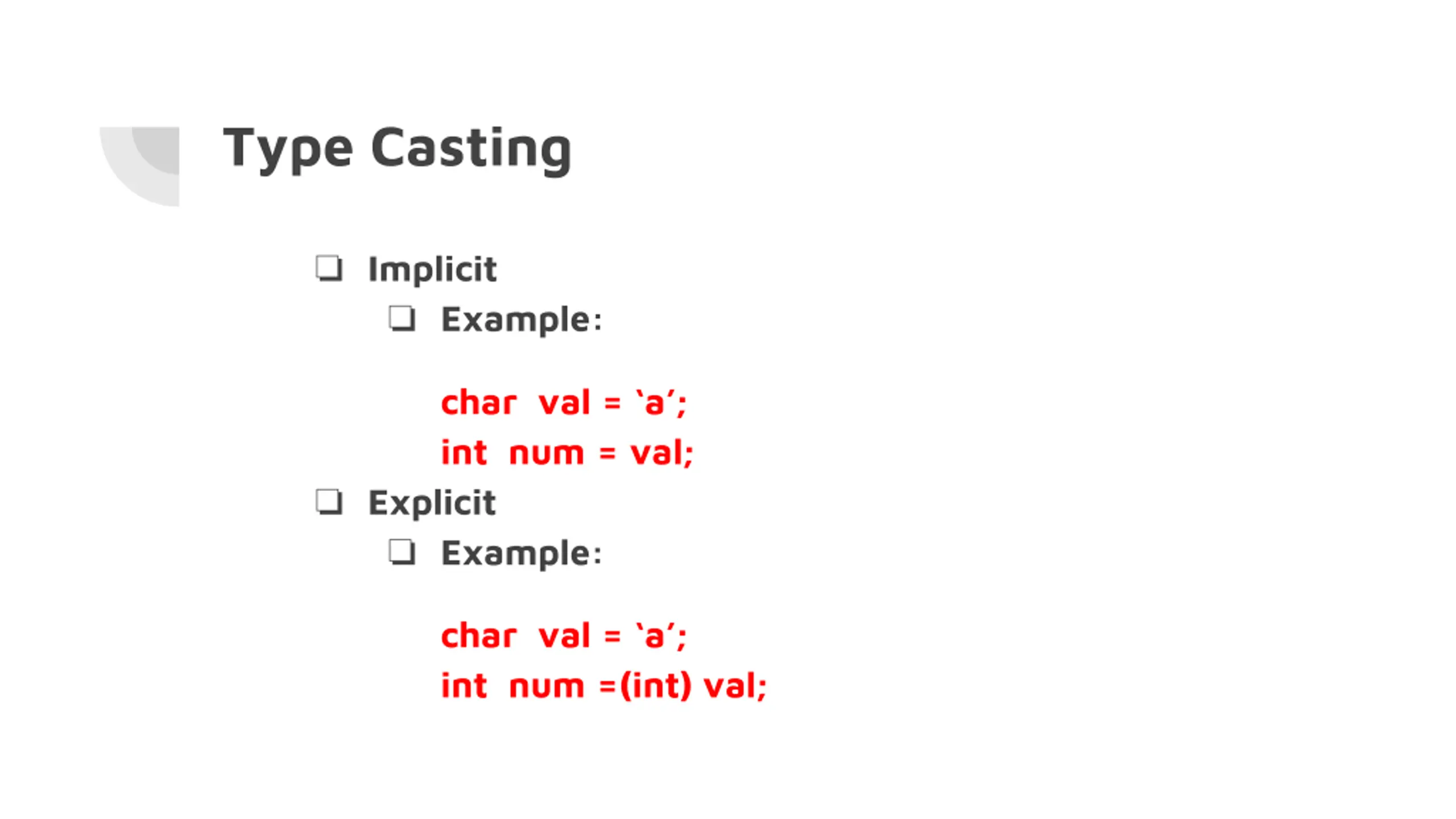 Type Casting Implicit Example: char val = a ; int num = val; Explicit Example: char val = a ; int num =(int) val;