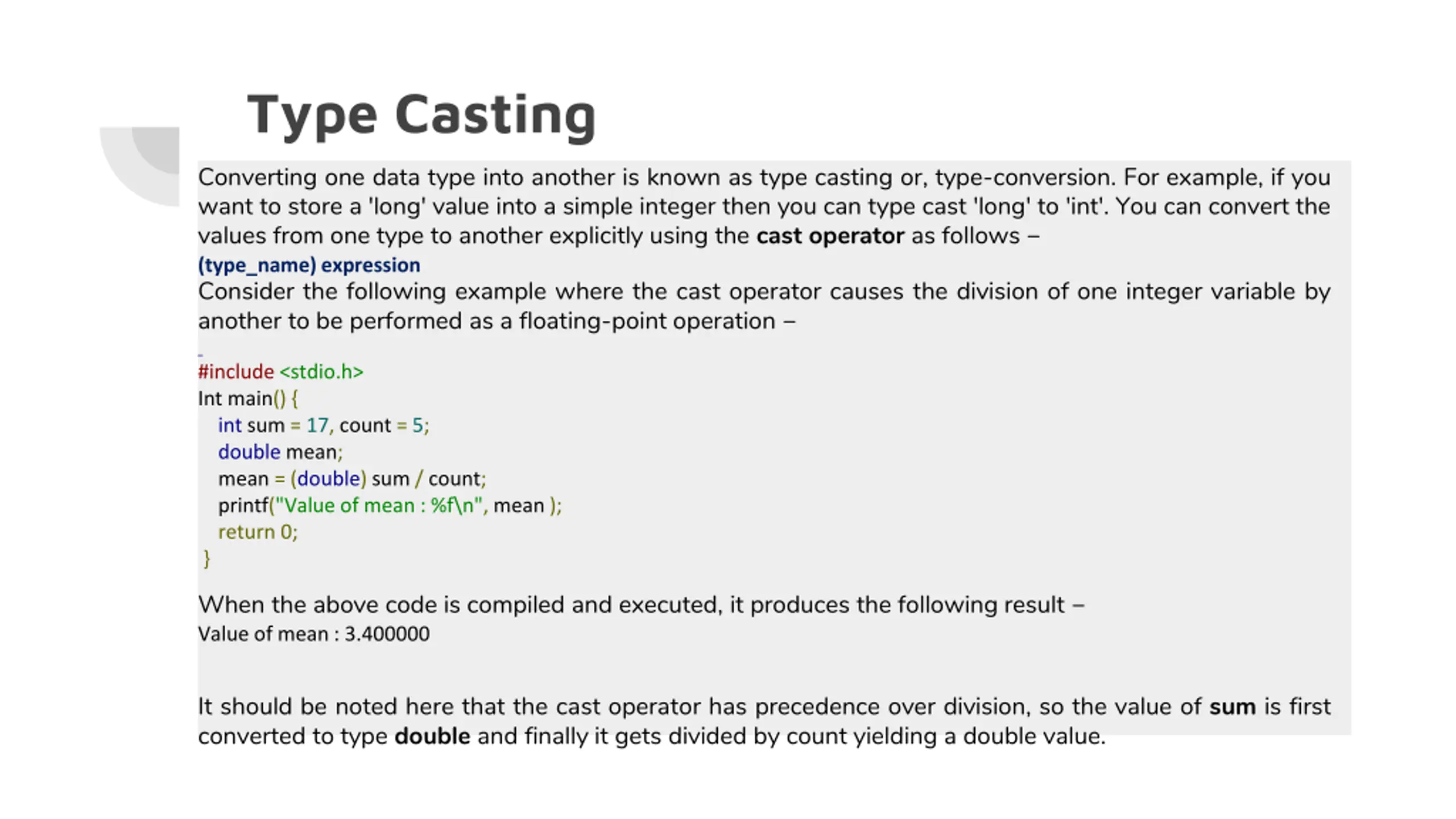 Type Casting Converting one data type into another is known as type casting or, type-conversion. For example, if you want to store a 'long' value into a simple integer then you can type cast 'long' to 'int'. You can convert the values from one type to another explicitly using the cast operator as follows (type_name)expression Consider the following example where the cast operator causes the division of one integer variable by another to be performed as a floating-point operation #include <stdio.h> Int main() { int sum = 17, count = 5; double mean; mean = (double) sum / count; printf("Value of mean : %f\n", mean ); return 0; } When the above code is compiled and executed, it produces the following result Value of mean : 3.400000 It should be noted here that the cast operator has precedence over division, so the value of sum is first converted to type double and finally it gets divided by count yielding a double value.
