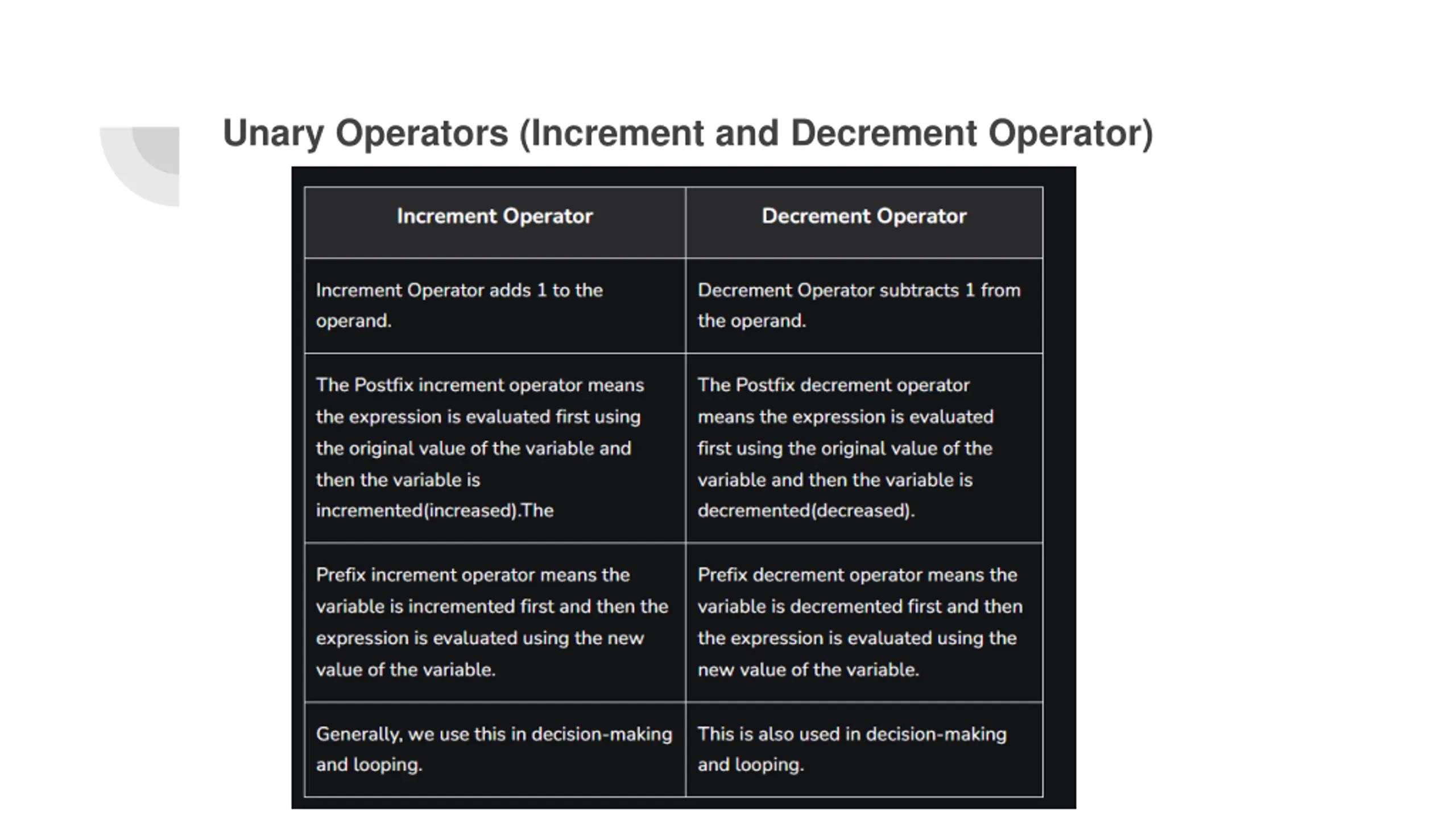 Unary Operators (Increment and Decrement Operator) The increment ( ++ ) and decrement (--) operators in C are unary operators for incrementing and values by 1 respectively. decrementing the numeric