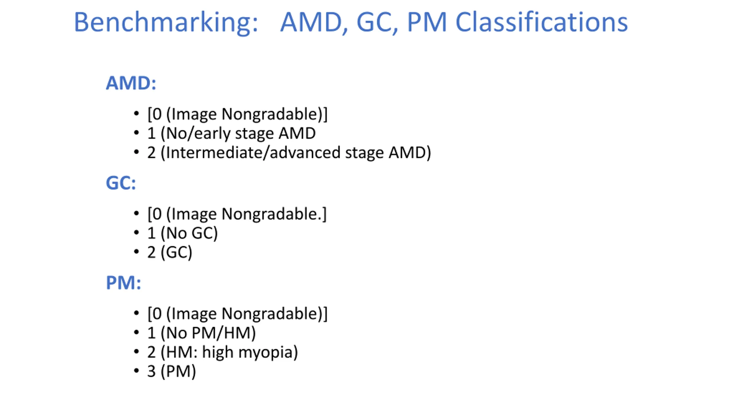 Benchmarking: AMD, GC, PM Classifications AMD: [0 (Image Nongradable)] 1 (No/early stage AMD 2 (Intermediate/advanced stage AMD) GC: [0 (Image Nongradable.] 1 (No GC) 2 (GC) PM: [0 (Image Nongradable)] 1 (No PM/HM) 2 (HM: high myopia) 3 (PM)