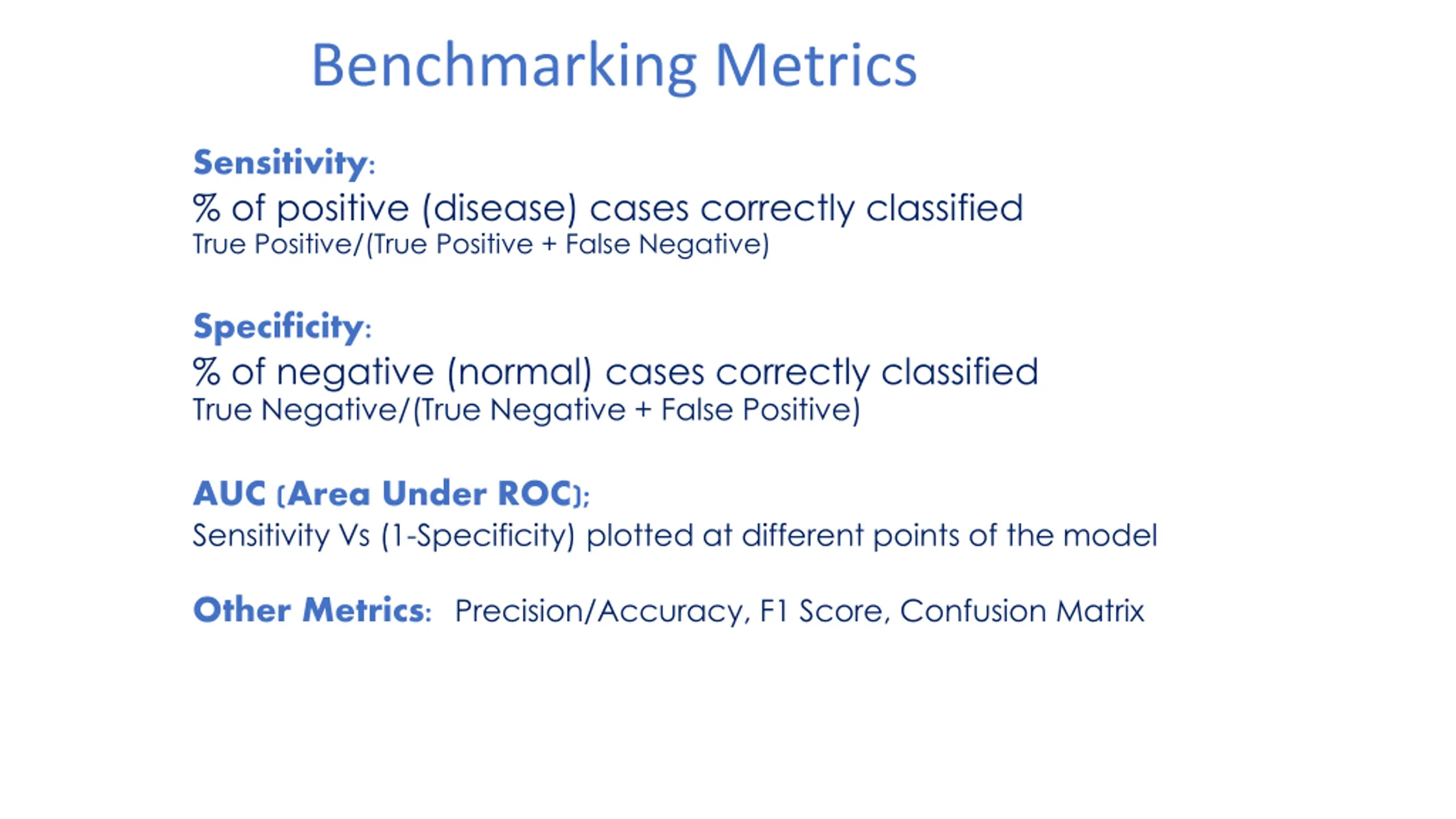 Benchmarking Metrics Sensitivity: % of positive (disease) cases correctly classified True Positive/(True Positive + False Negative) Specificity: % of negative (normal) cases correctly classified True Negative/(True Negative + False Positive) AUC (Area Under ROC); Sensitivity Vs (1-Specificity) plotted at different points of the model Other Metrics: Precision/Accuracy, F1 Score, Confusion Matrix