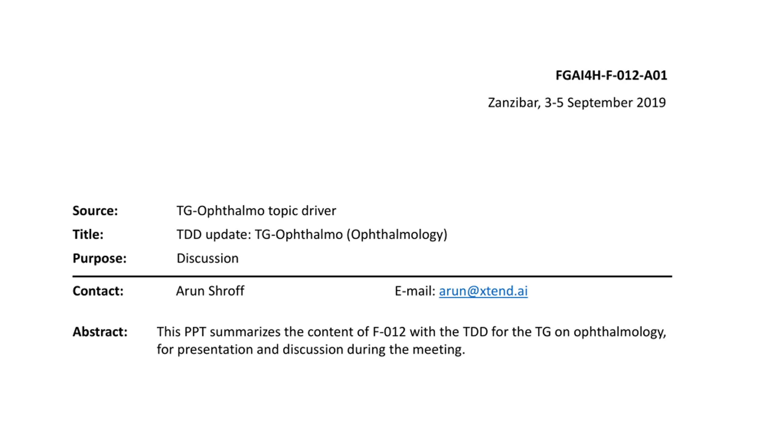 FGAI4H-F-012-A01 Zanzibar, 3-5 September 2019 Source: TG-Ophthalmo topic driver Title: TDD update: TG-Ophthalmo (Ophthalmology) Purpose: Discussion Contact: Arun Shroff E-mail: arun@xtend.ai Abstract: This PPT summarizes the content of F-012 with the TDD for the TG on ophthalmology, for presentation and discussion during the meeting.