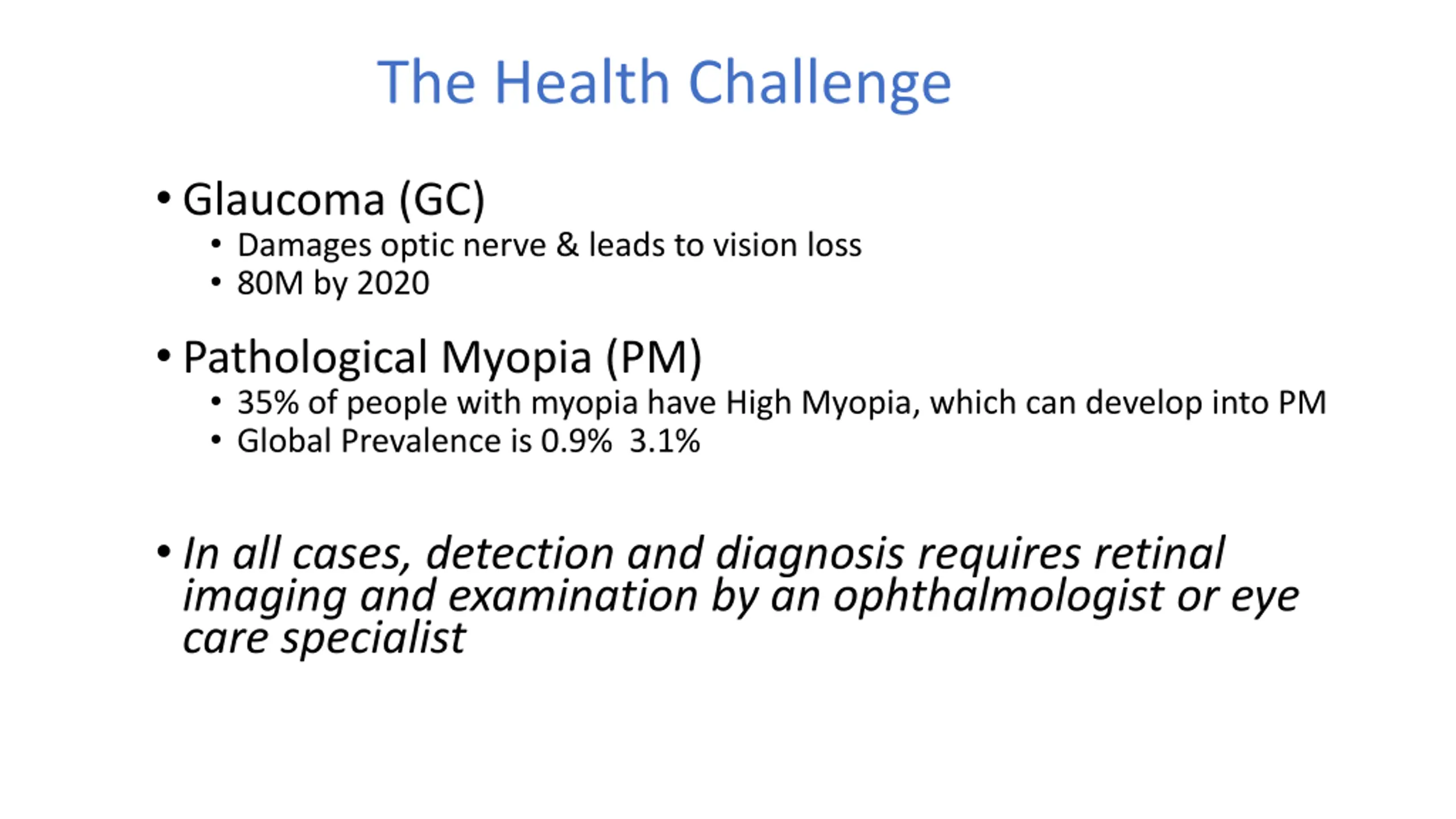 The Health Challenge Glaucoma (GC) Damages optic nerve & leads to vision loss 80M by 2020 Pathological Myopia (PM) 35% of people with myopia have High Myopia, which can develop into PM Global Prevalence is 0.9% 3.1% In all cases, detection and diagnosis requires retinal imaging and examination by an ophthalmologist or eye care specialist
