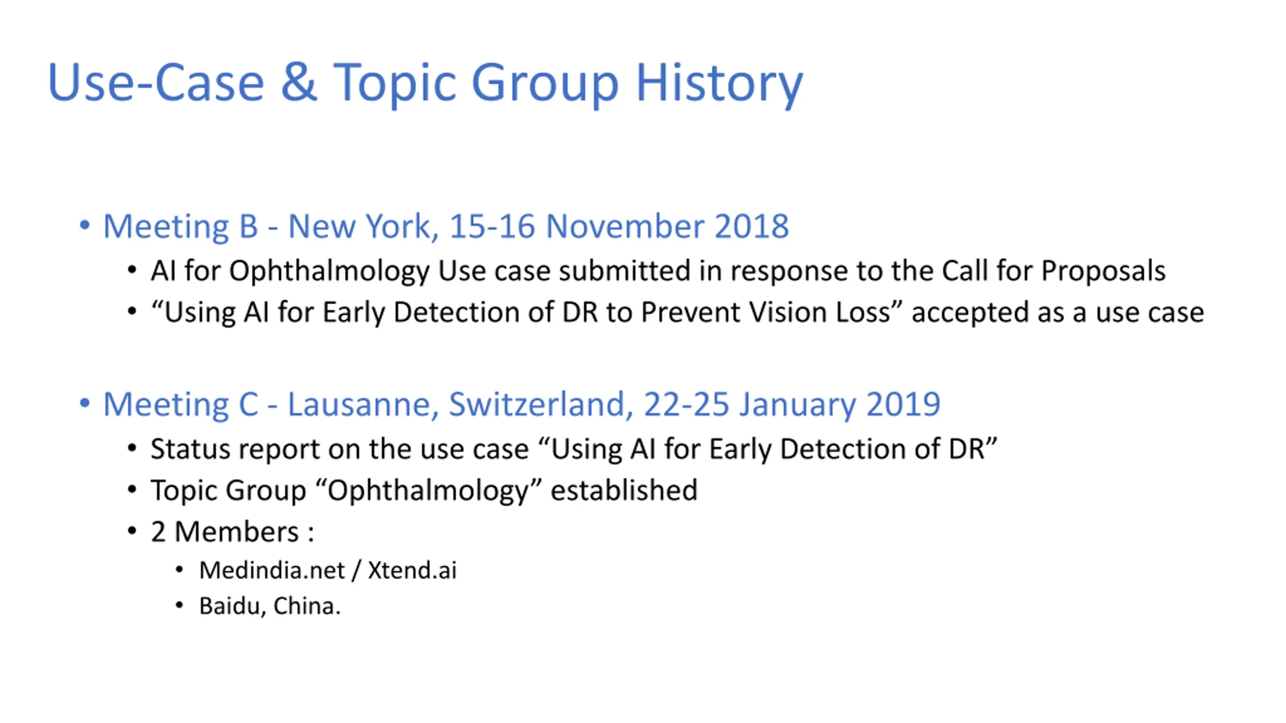 Use-Case & Topic Group History Meeting B - New York, 15-16 November 2018 AI for Ophthalmology Use case submitted in response to the Call for Proposals Using AI for Early Detection of DR to Prevent Vision Loss accepted as a use case Meeting C - Lausanne, Switzerland, 22-25 January 2019 Status report on the use case Using AI for Early Detection of DR Topic Group Ophthalmology established 2 Members : Medindia.net / Xtend.ai Baidu, China.