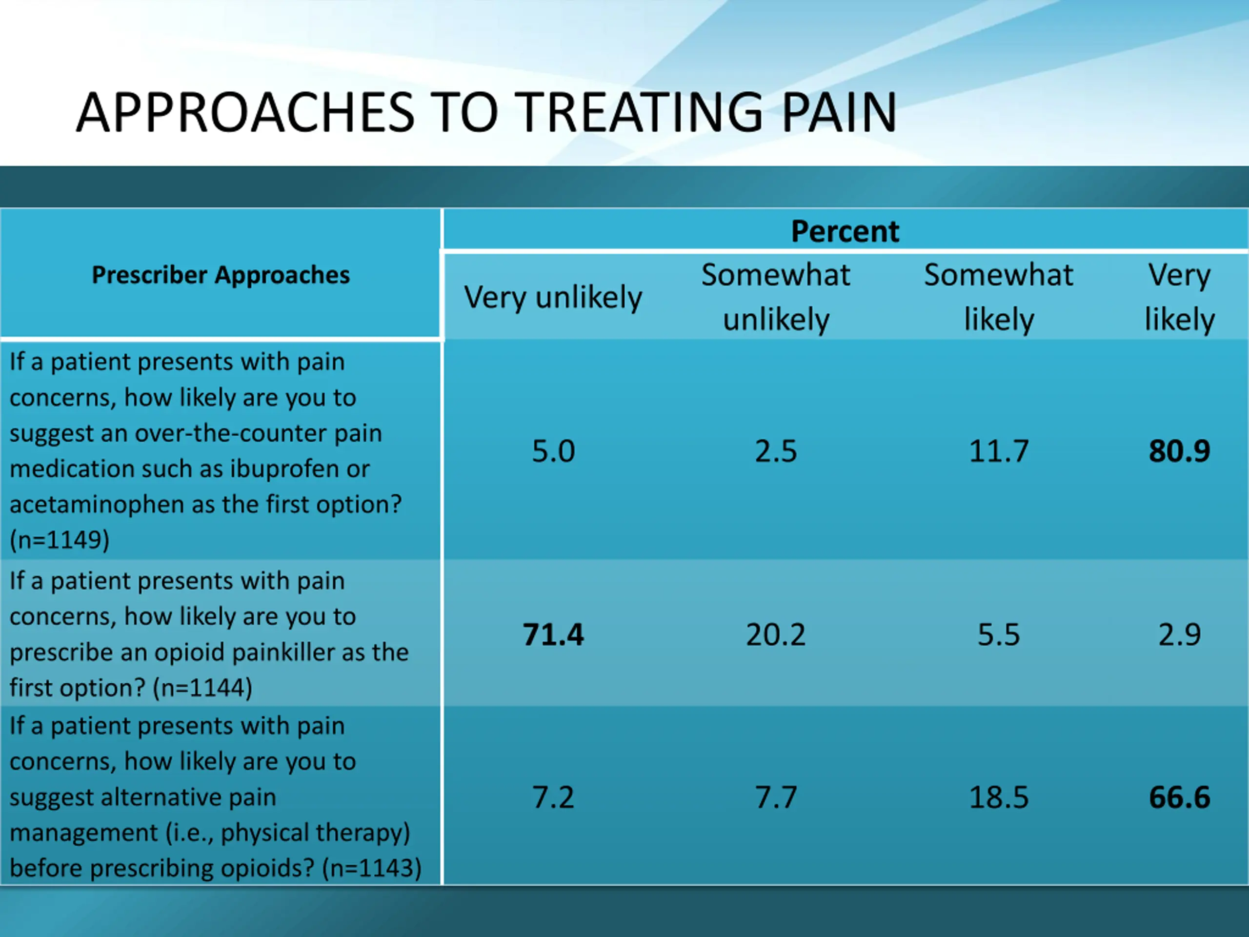 APPROACHES TO TREATING PAIN Percent Somewhat unlikely Somewhat likely Very likely Prescriber Approaches Very unlikely If a patient presents with pain concerns, how likely are you to suggest an over-the-counter pain medication such as ibuprofen or acetaminophen as the first option? (n=1149) If a patient presents with pain concerns, how likely are you to prescribe an opioid painkiller as the first option? (n=1144) If a patient presents with pain concerns, how likely are you to suggest alternative pain management (i.e., physical therapy) before prescribing opioids? (n=1143) 5.0 2.5 11.7 80.9 71.4 20.2 5.5 2.9 7.2 7.7 18.5 66.6
