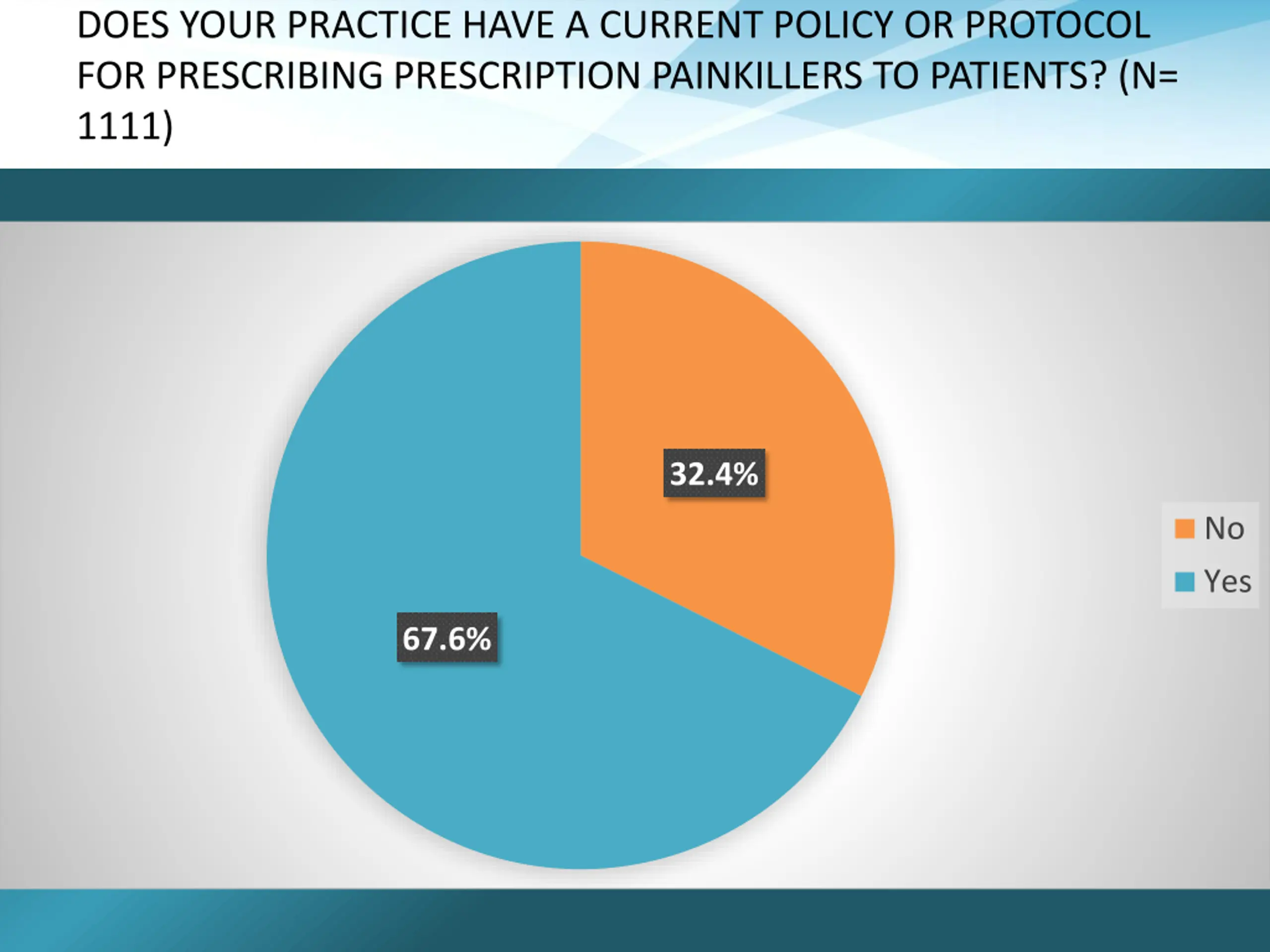 DOES YOUR PRACTICE HAVE A CURRENT POLICY OR PROTOCOL FOR PRESCRIBING PRESCRIPTION PAINKILLERS TO PATIENTS? (N= 1111) 32.4% No Yes 67.6%