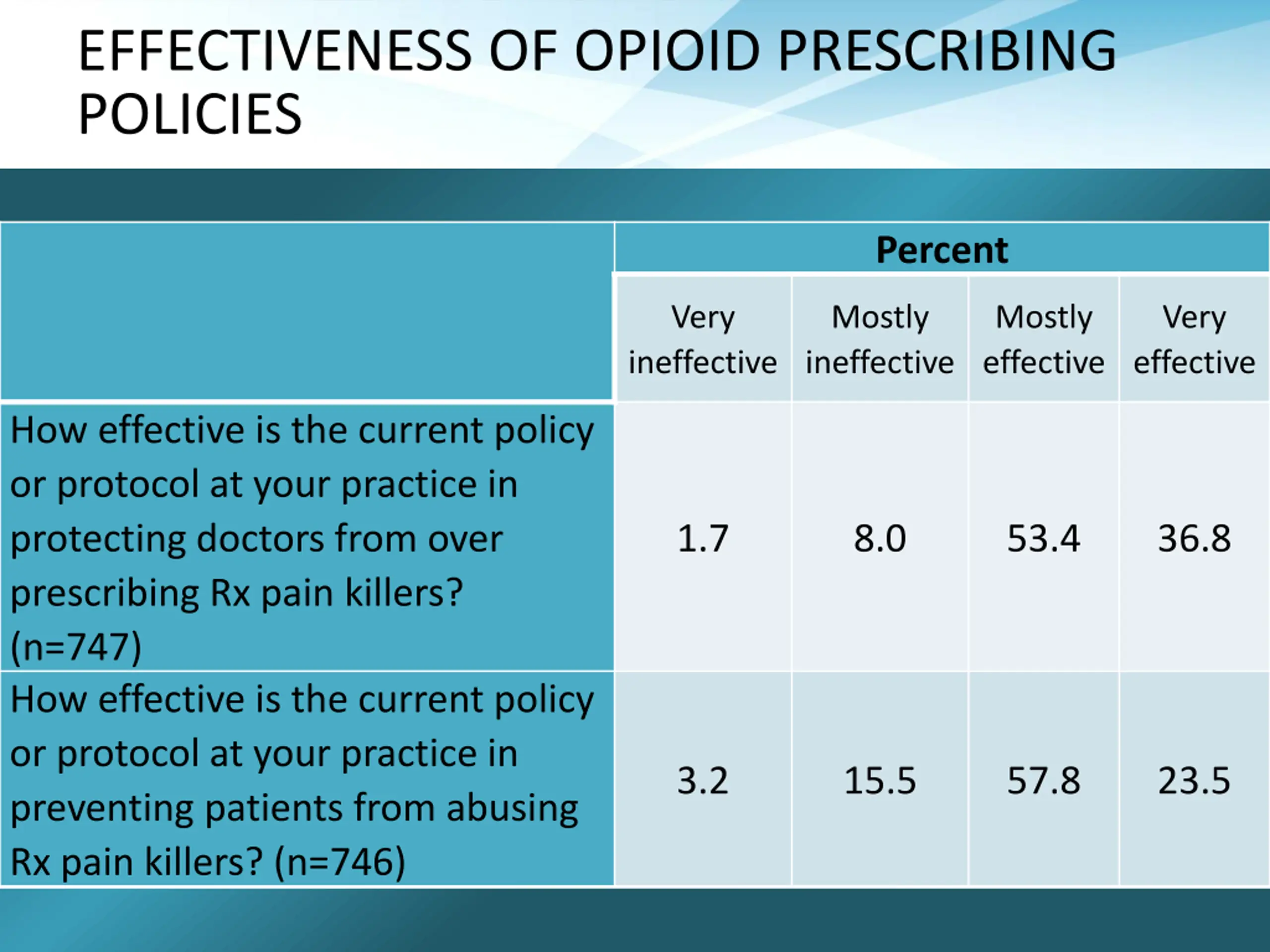 EFFECTIVENESS OF OPIOID PRESCRIBING POLICIES Percent Very Mostly ineffective Mostly effective Very effective ineffective How effective is the current policy or protocol at your practice in protecting doctors from over prescribing Rx pain killers? (n=747) How effective is the current policy or protocol at your practice in preventing patients from abusing Rx pain killers? (n=746) 1.7 8.0 53.4 36.8 3.2 15.5 57.8 23.5