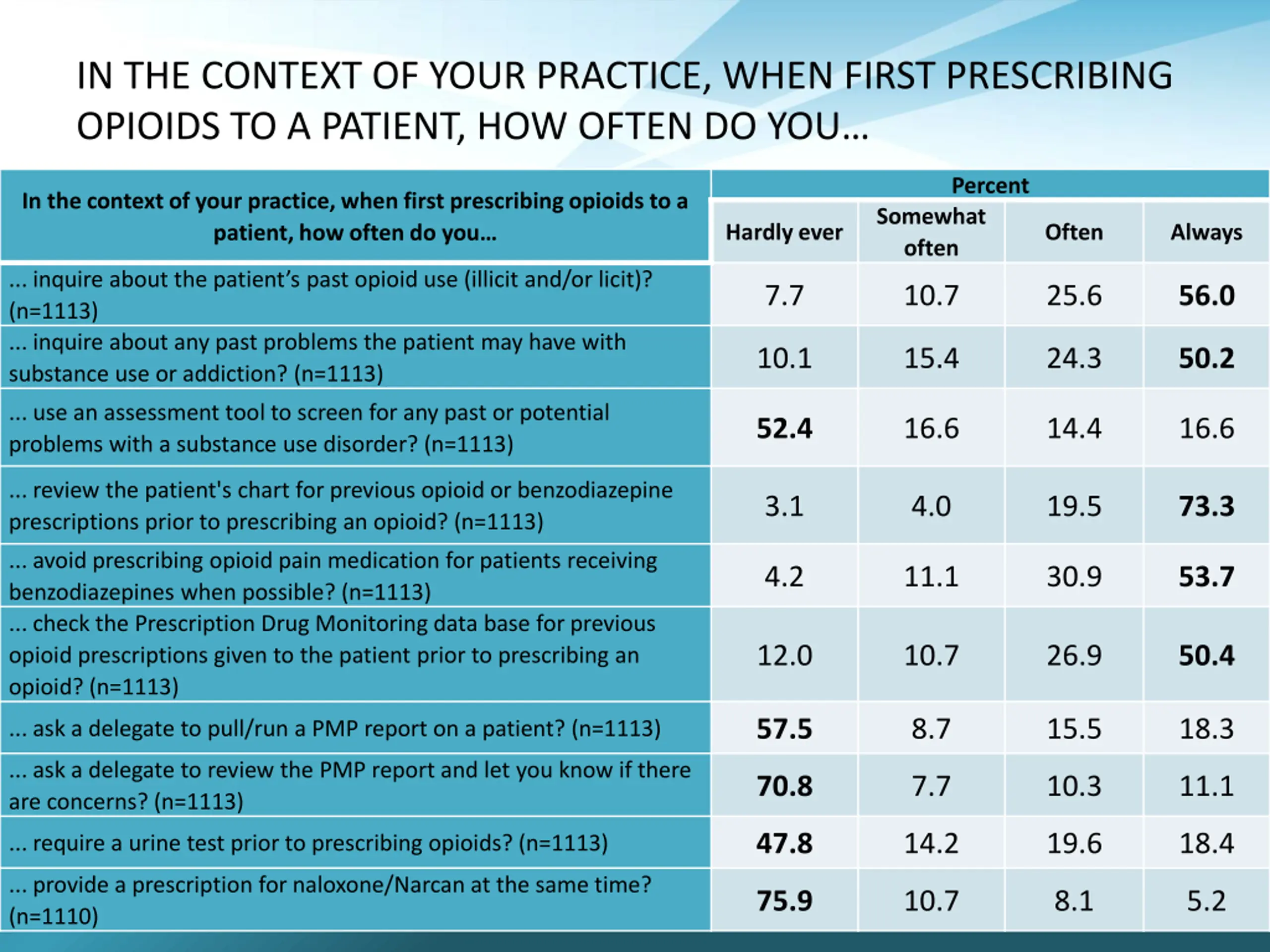 IN THE CONTEXT OF YOUR PRACTICE, WHEN FIRST PRESCRIBING OPIOIDS TO A PATIENT, HOW OFTEN DO YOU Percent In the context of your practice, when first prescribing opioids to a patient, how often do you Somewhat often Hardly ever Often Always ... inquire about the patient s past opioid use (illicit and/or licit)? (n=1113) ... inquire about any past problems the patient may have with substance use or addiction? (n=1113) 7.7 10.7 25.6 56.0 10.1 15.4 24.3 50.2 ... use an assessment tool to screen for any past or potential problems with a substance use disorder? (n=1113) 52.4 16.6 14.4 16.6 ... review the patient's chart for previous opioid or benzodiazepine prescriptions prior to prescribing an opioid? (n=1113) 3.1 4.0 19.5 73.3 ... avoid prescribing opioid pain medication for patients receiving benzodiazepines when possible? (n=1113) ... check the Prescription Drug Monitoring data base for previous opioid prescriptions given to the patient prior to prescribing an opioid? (n=1113) 4.2 11.1 30.9 53.7 12.0 10.7 26.9 50.4 57.5 8.7 15.5 18.3 ... ask a delegate to pull/run a PMP report on a patient? (n=1113) ... ask a delegate to review the PMP report and let you know if there are concerns? (n=1113) 70.8 7.7 10.3 11.1 47.8 14.2 19.6 18.4 ... require a urine test prior to prescribing opioids? (n=1113) ... provide a prescription for naloxone/Narcan at the same time? (n=1110) 75.9 10.7 8.1 5.2