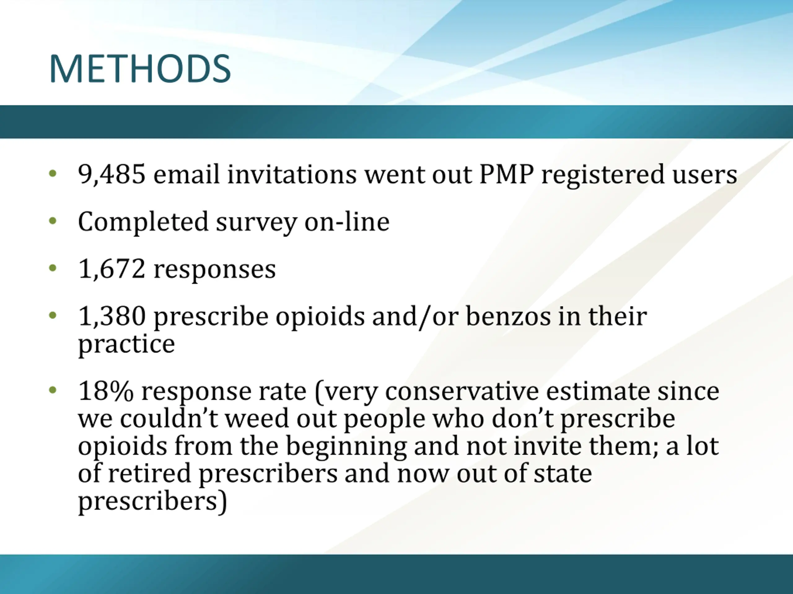 METHODS 9,485 email invitations went out PMP registered users Completed survey on-line 1,672 responses 1,380 prescribe opioids and/or benzos in their practice 18% response rate (very conservative estimate since we couldn t weed out people who don t prescribe opioids from the beginning and not invite them; a lot of retired prescribers and now out of state prescribers)