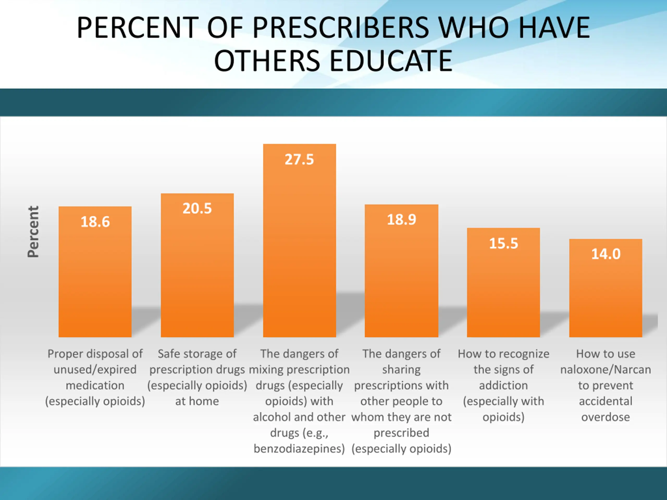 PERCENT OF PRESCRIBERS WHO HAVE OTHERS EDUCATE 27.5 20.5 Percent 18.9 18.6 15.5 14.0 Proper disposal of unused/expired medication (especially opioids) Safe storage of prescription drugs (especially opioids) at home The dangers of mixing prescription drugs (especially opioids) with alcohol and other drugs (e.g., benzodiazepines) The dangers of sharing prescriptions with other people to whom they are not prescribed (especially opioids) How to recognize the signs of addiction (especially with opioids) How to use naloxone/Narcan to prevent accidental overdose