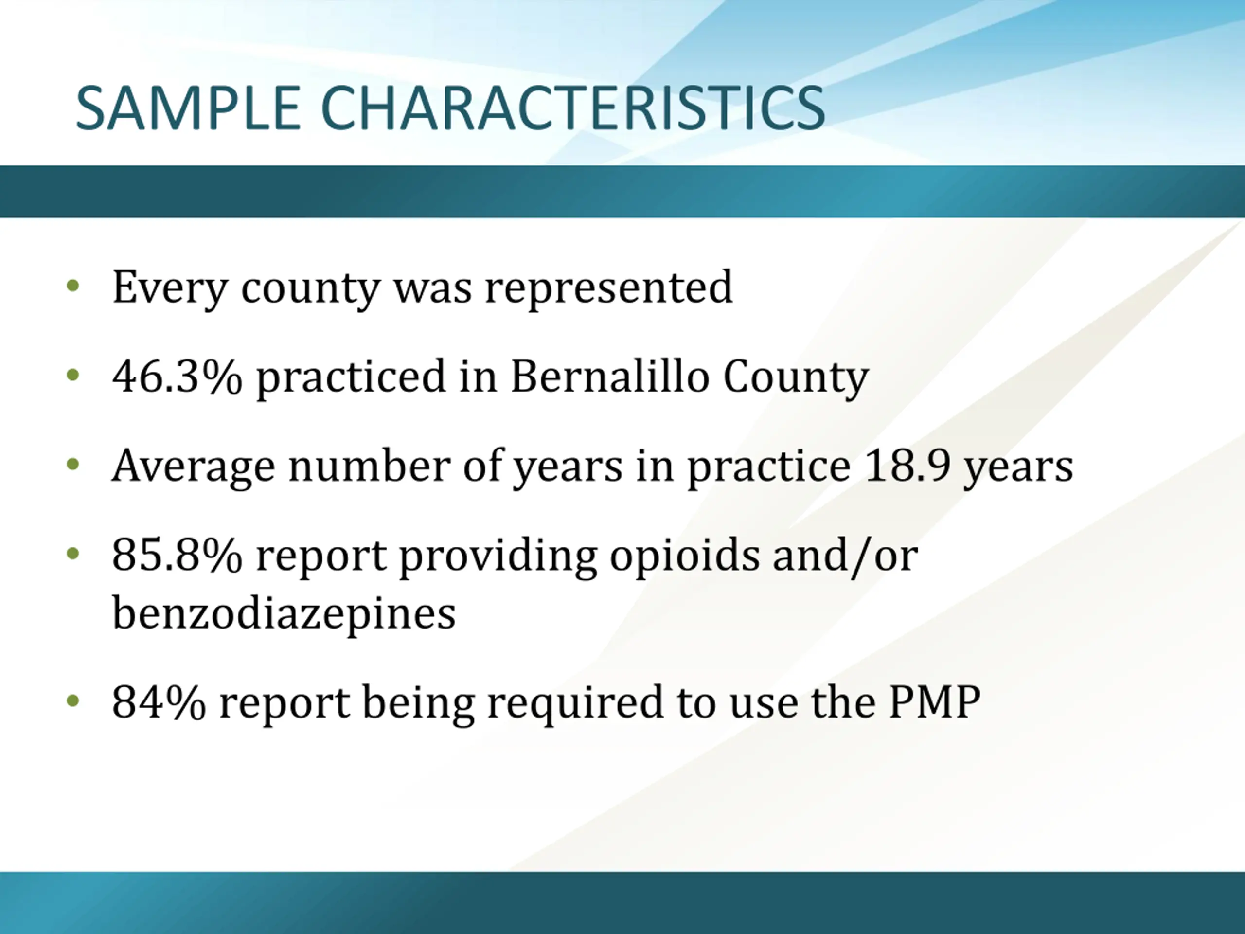 SAMPLE CHARACTERISTICS Every county was represented 46.3% practiced in Bernalillo County Average number of years in practice 18.9 years 85.8% report providing opioids and/or benzodiazepines 84% report being required to use the PMP
