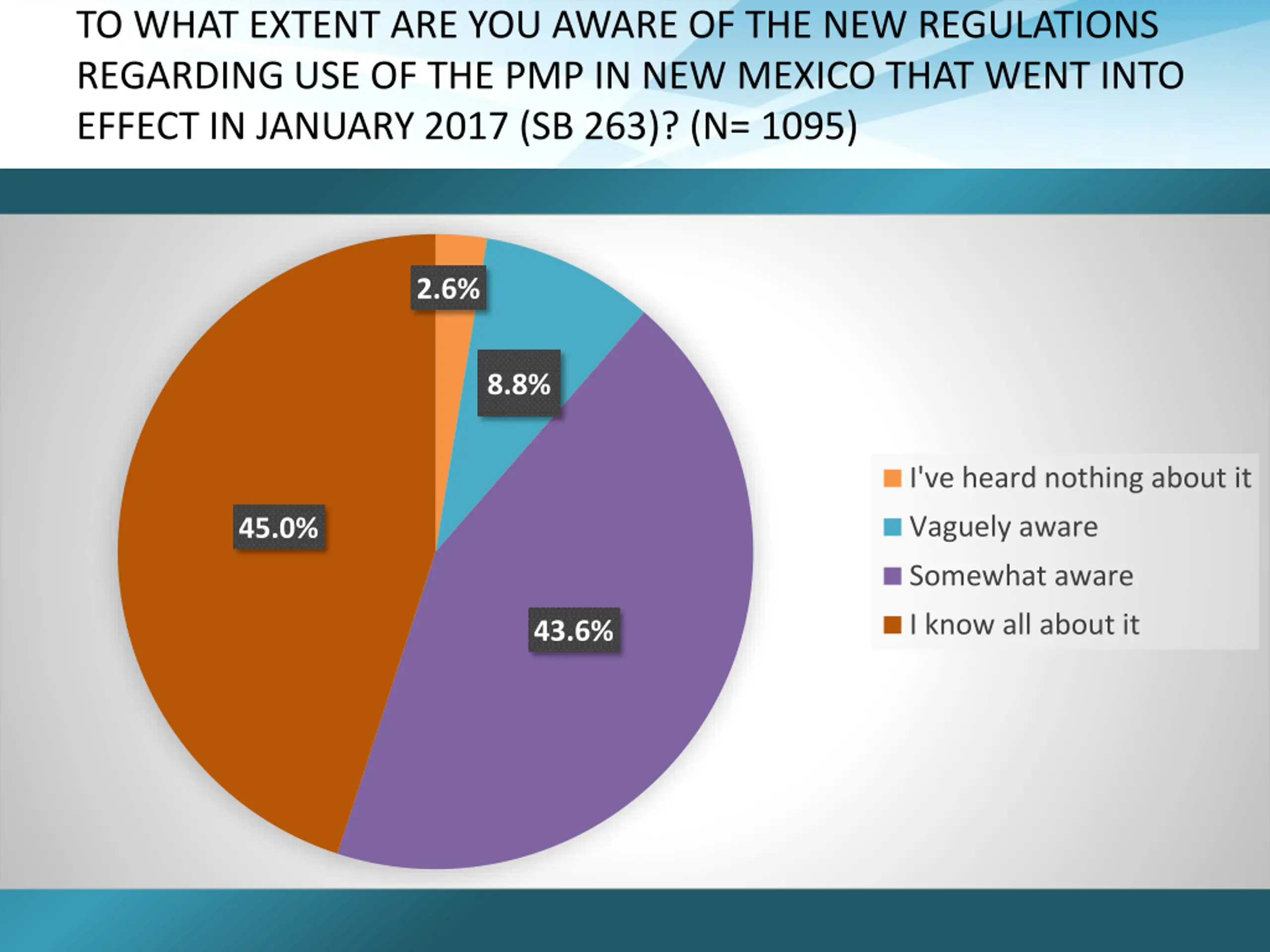 TO WHAT EXTENT ARE YOU AWARE OF THE NEW REGULATIONS REGARDING USE OF THE PMP IN NEW MEXICO THAT WENT INTO EFFECT IN JANUARY 2017 (SB 263)? (N= 1095) 2.6% 8.8% I've heard nothing about it Vaguely aware 45.0% Somewhat aware I know all about it 43.6%