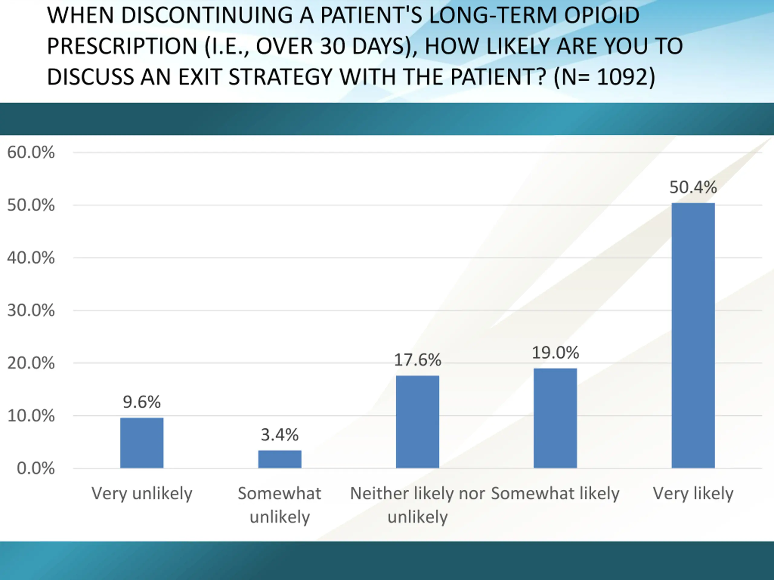 WHEN DISCONTINUING A PATIENT'S LONG-TERM OPIOID PRESCRIPTION (I.E., OVER 30 DAYS), HOW LIKELY ARE YOU TO DISCUSS AN EXIT STRATEGY WITH THE PATIENT? (N= 1092) 60.0% 50.4% 50.0% 40.0% 30.0% 19.0% 17.6% 20.0% 9.6% 10.0% 3.4% 0.0% Very unlikely Somewhat unlikely Neither likely nor unlikely Somewhat likely Very likely